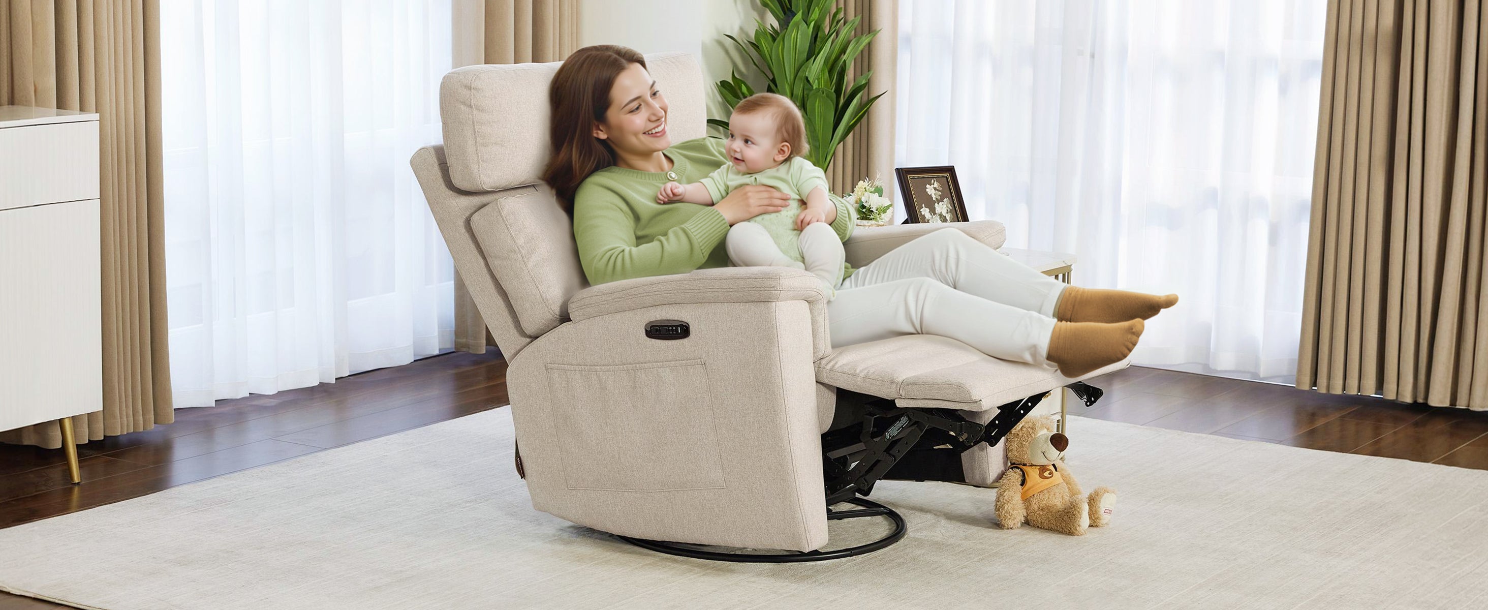 Crafted with certified, baby-safe fabric, our nursery recliner is designed to meet high safety and quality standards. The material is carefully selected to be gentle on skin, free from harmful substances, and suitable for everyday use in nurseries. Enjoy peace of mind and lasting comfort in a space made for you and your baby.
