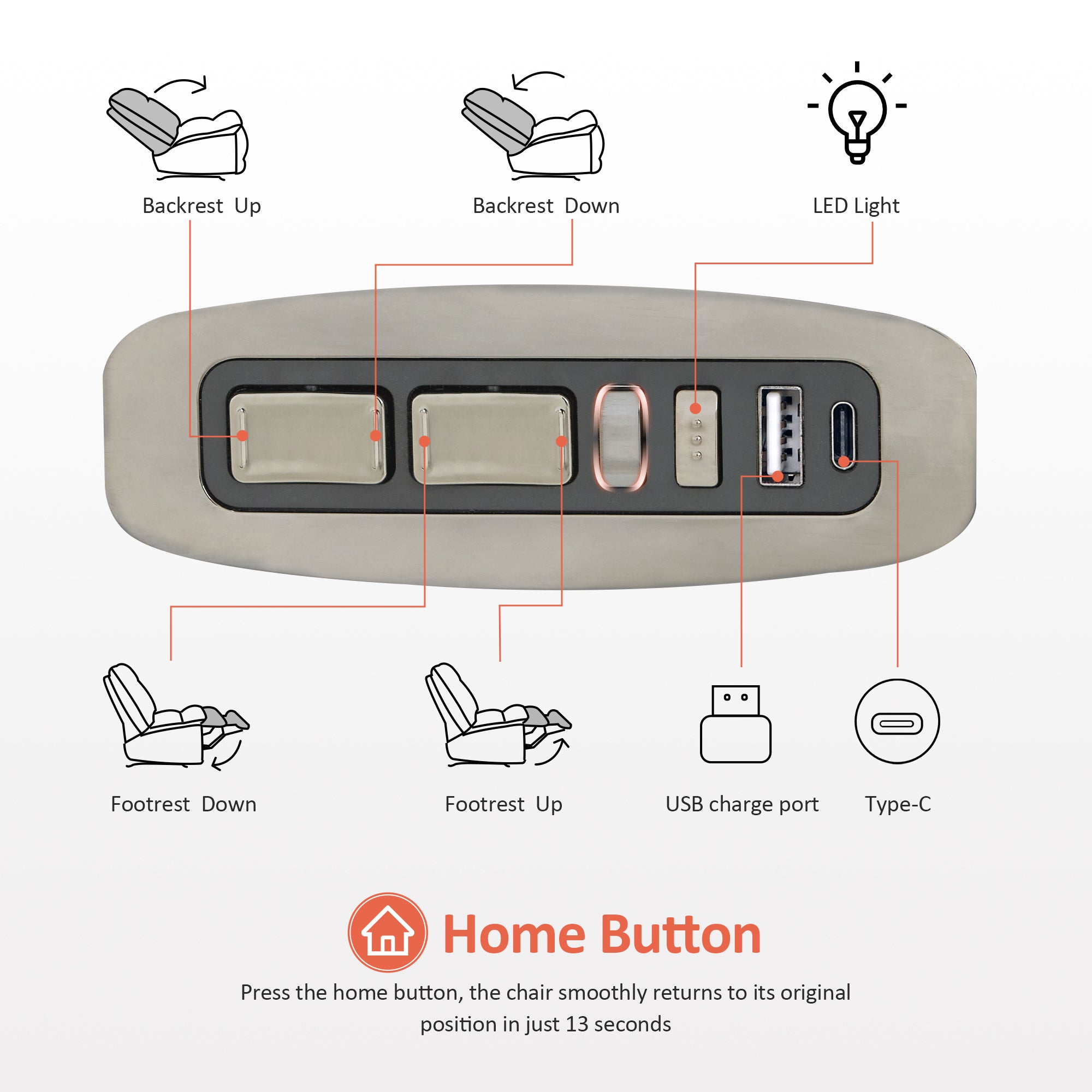 - ONE-TOUCH RESET & LED LIGHTING. Press the home button, and the chair smoothly returns to its original position in just 13 seconds. The dual USB &Type C ports on the armrest support any phone or pad, and LED lighting for added relaxation