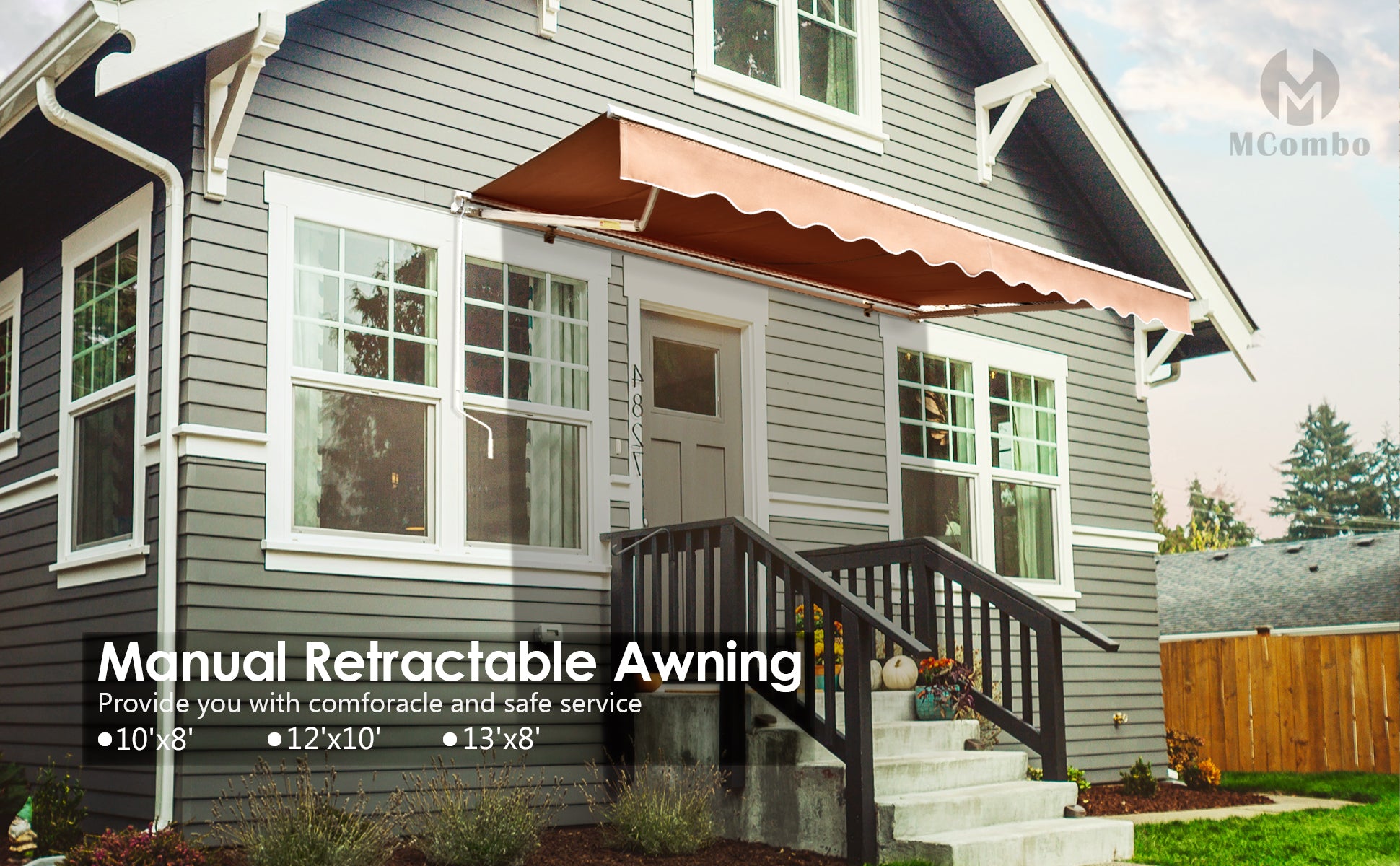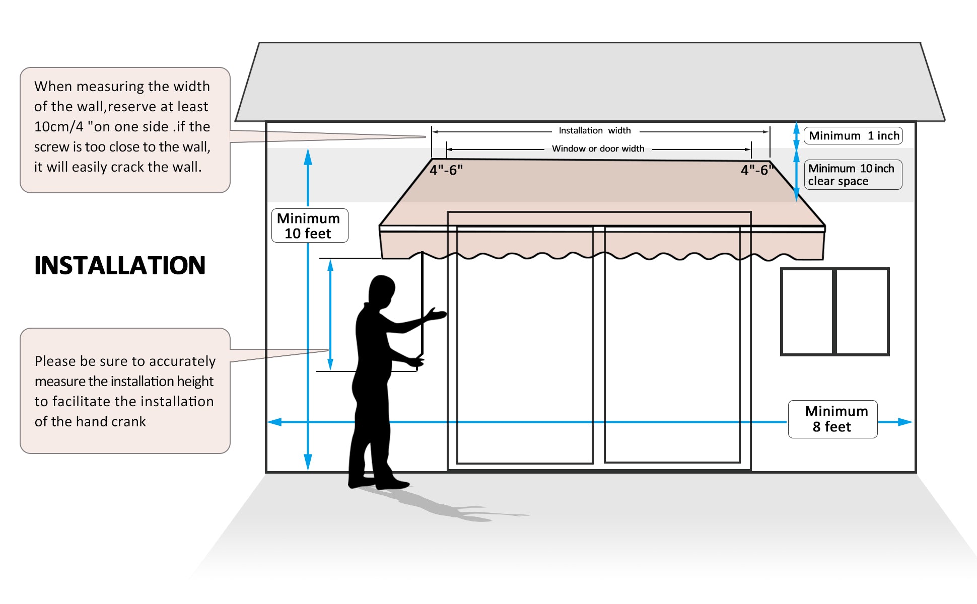 - 【Installation Instructions】 Awning, crank handle, bracket, 2 Retractable mounting brackets, instruction manual and additional mounting hardware - open/close by hand crank. Note:Please prepare the following tools before installation(not included with the product):Power drill with drilling bit, Tape, Wrench.
