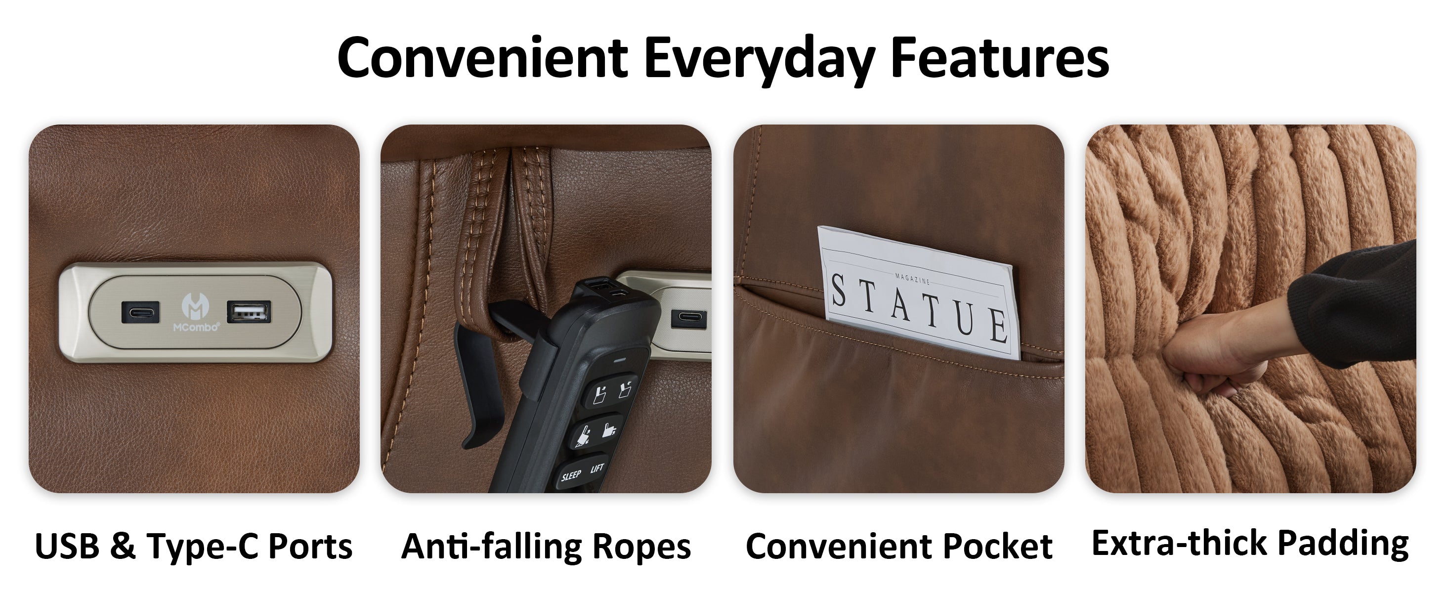 - Convenience at Your Fingertips: The built-in cup holder keeps drinks within easy reach, while the armrest loop securely holds the remote to prevent drops. The USB charging port lets you power devices without leaving your seat, everything you need is right at hand.