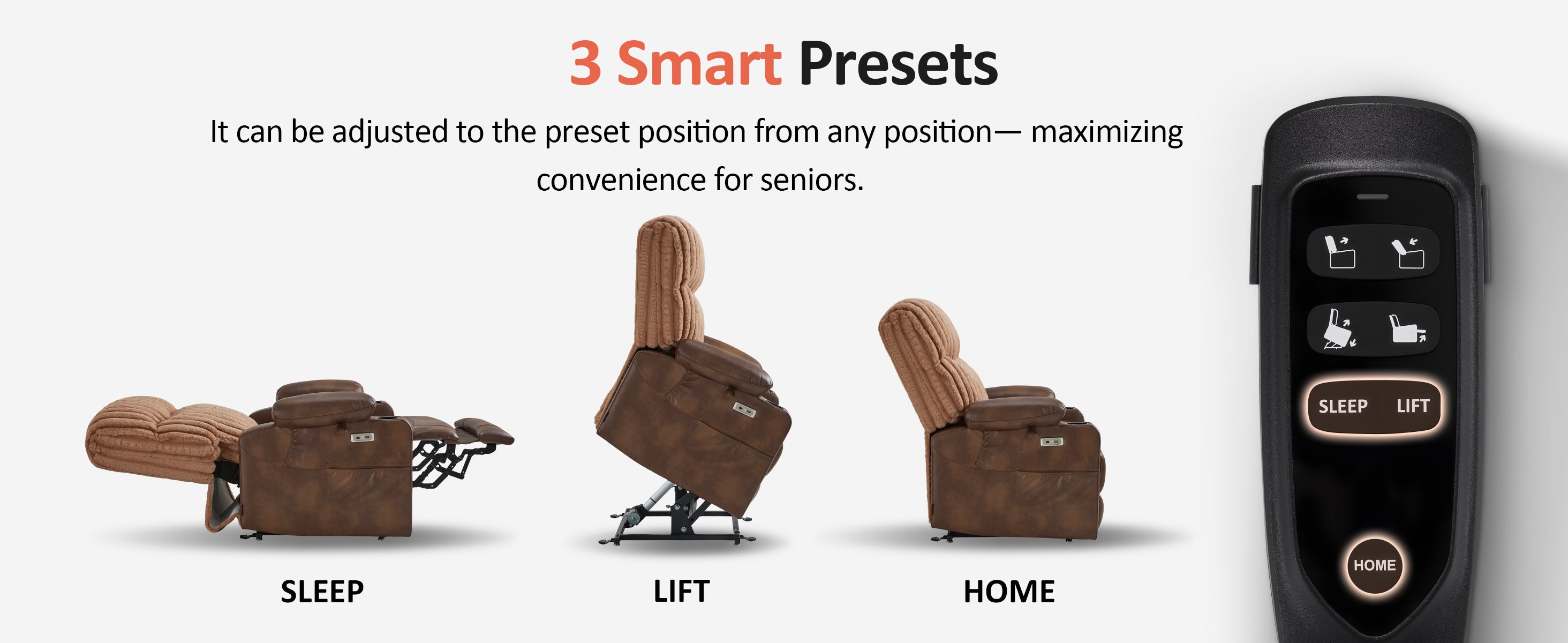 - Convenience with Smart Presets: One button seamlessly lifts to a standing position, another reclines completely flat, eliminating complex multi-step adjustments