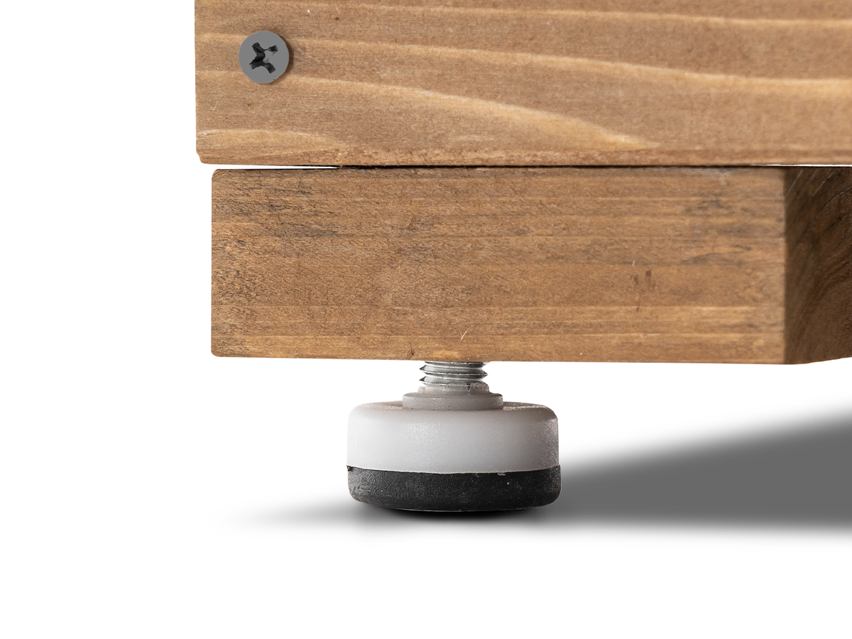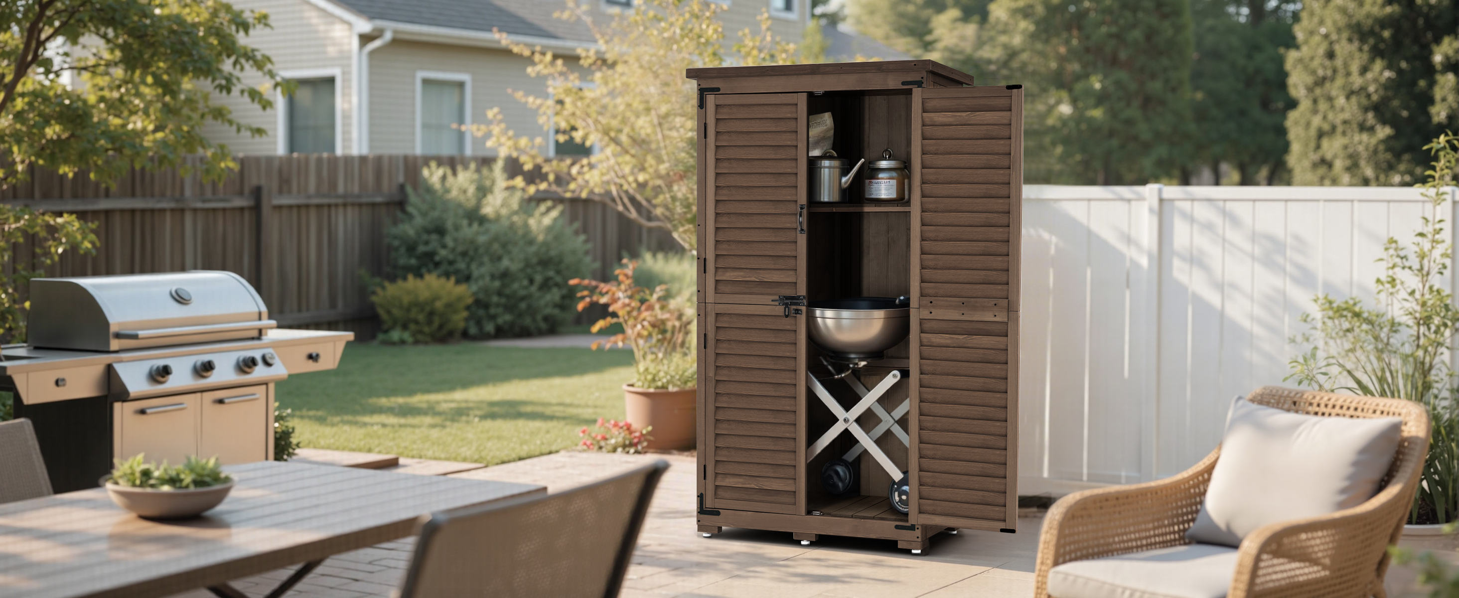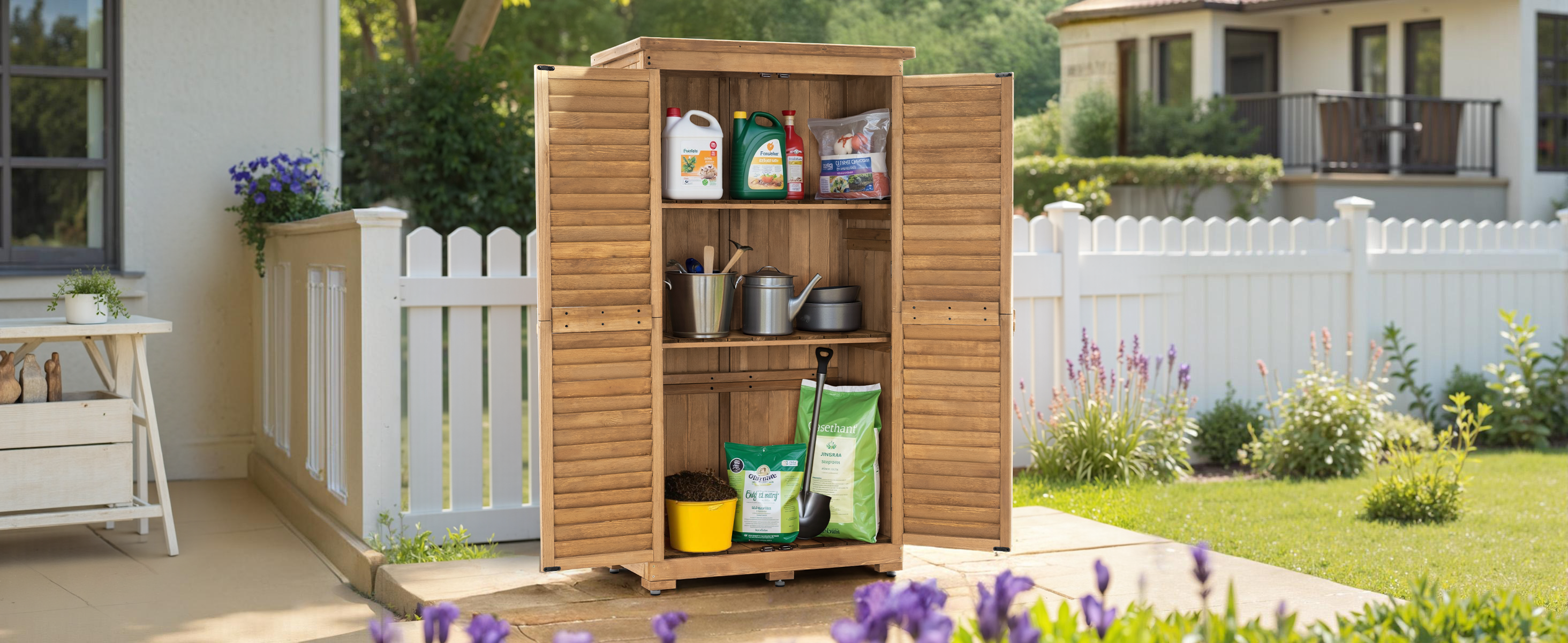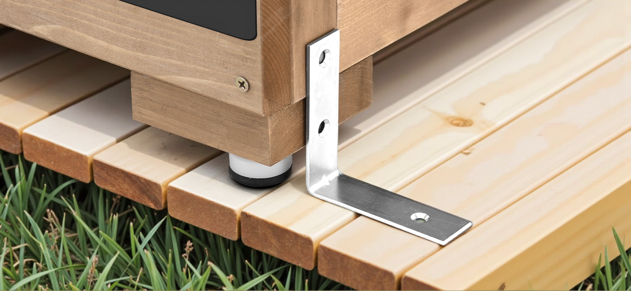 4 Metal Brackets & 6 Adjustable Feet: There are 4 metal brackets to better fix the garden storage woodshed. And the outdoor storage tool cabinet has 6 adjustable feet, so don't worry about the stability.