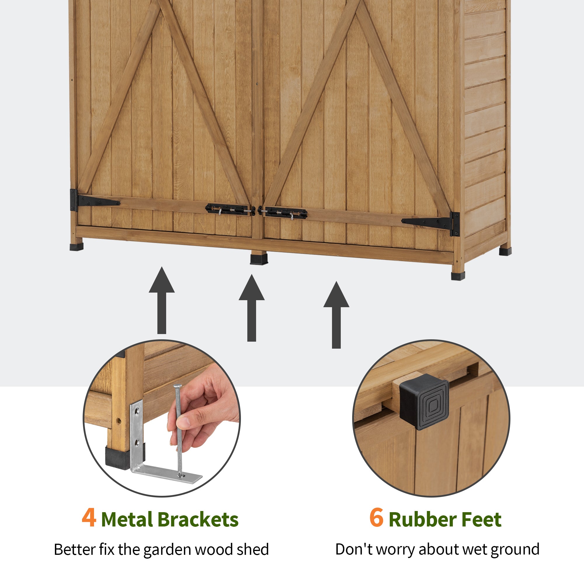 4 Metal Brackets: There are 4 metal brackets to better fix the garden storage wood shed. At the same time, the outdoor storage tool shed has a raised bottom, so don't worry about the uneven ground.