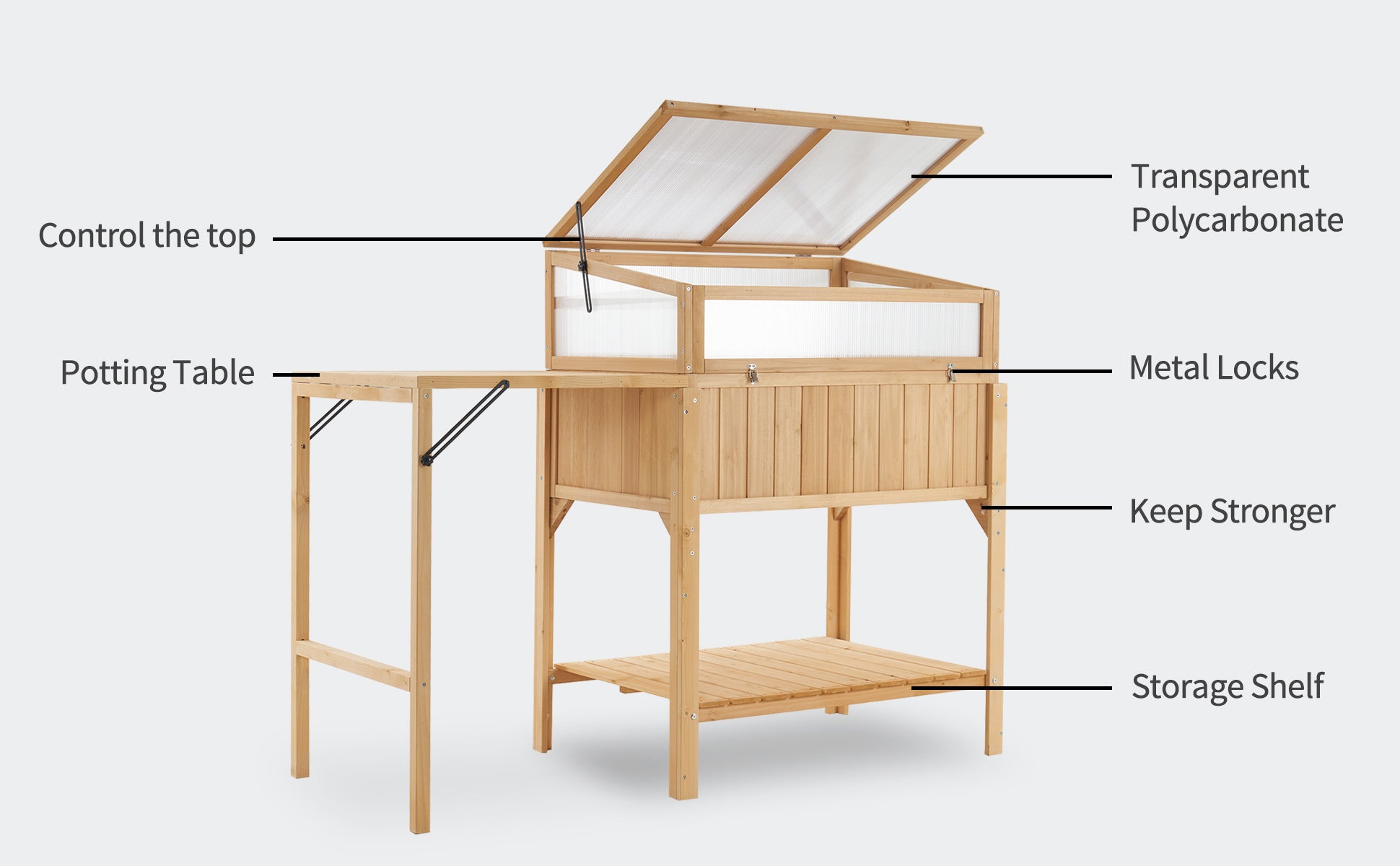 - Foldable Potting Table: This wooden greenhouse is equipped with a detachable small potting table, which provides you with enough placing and working space.