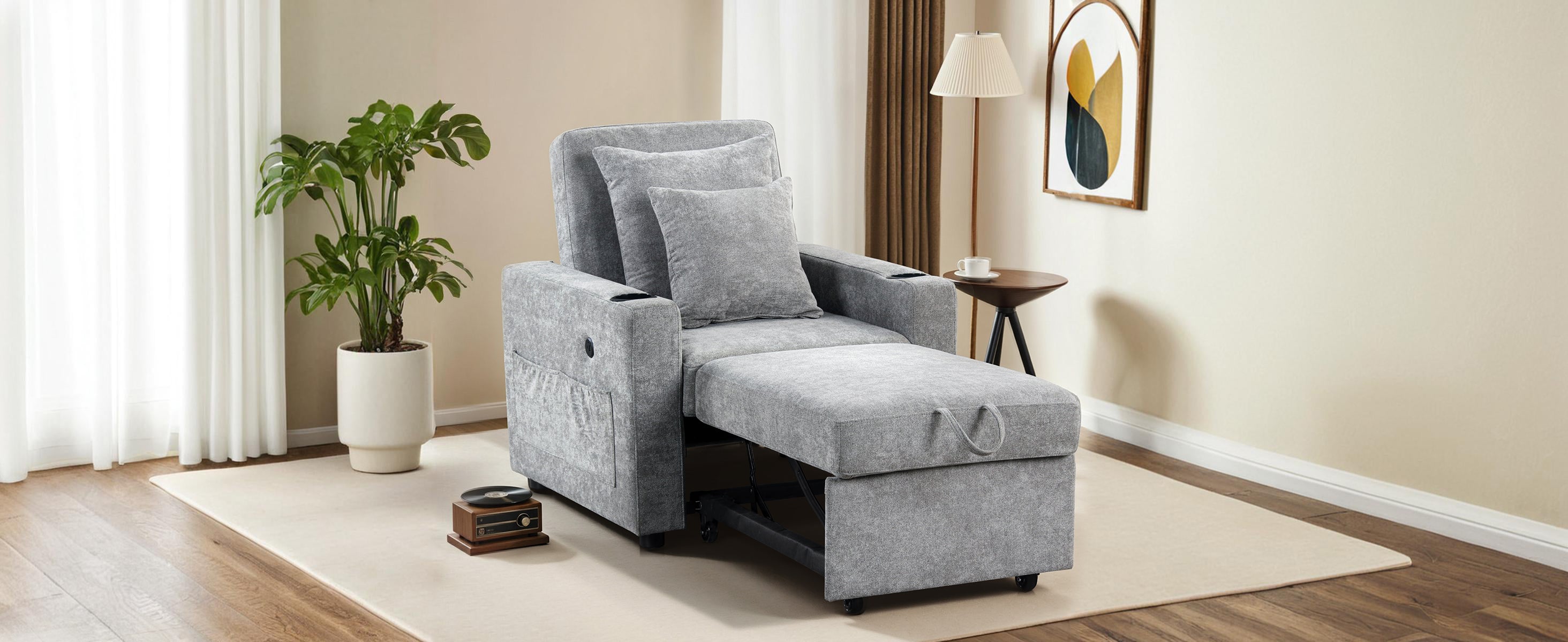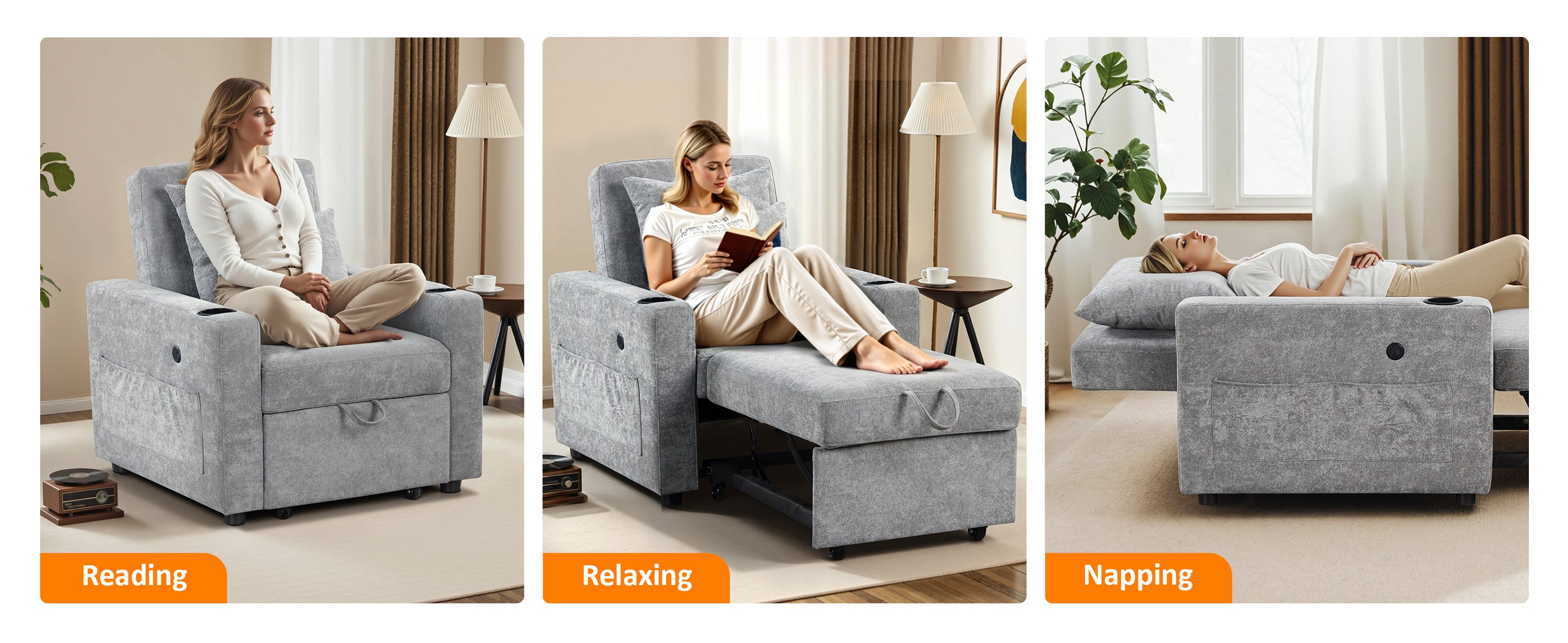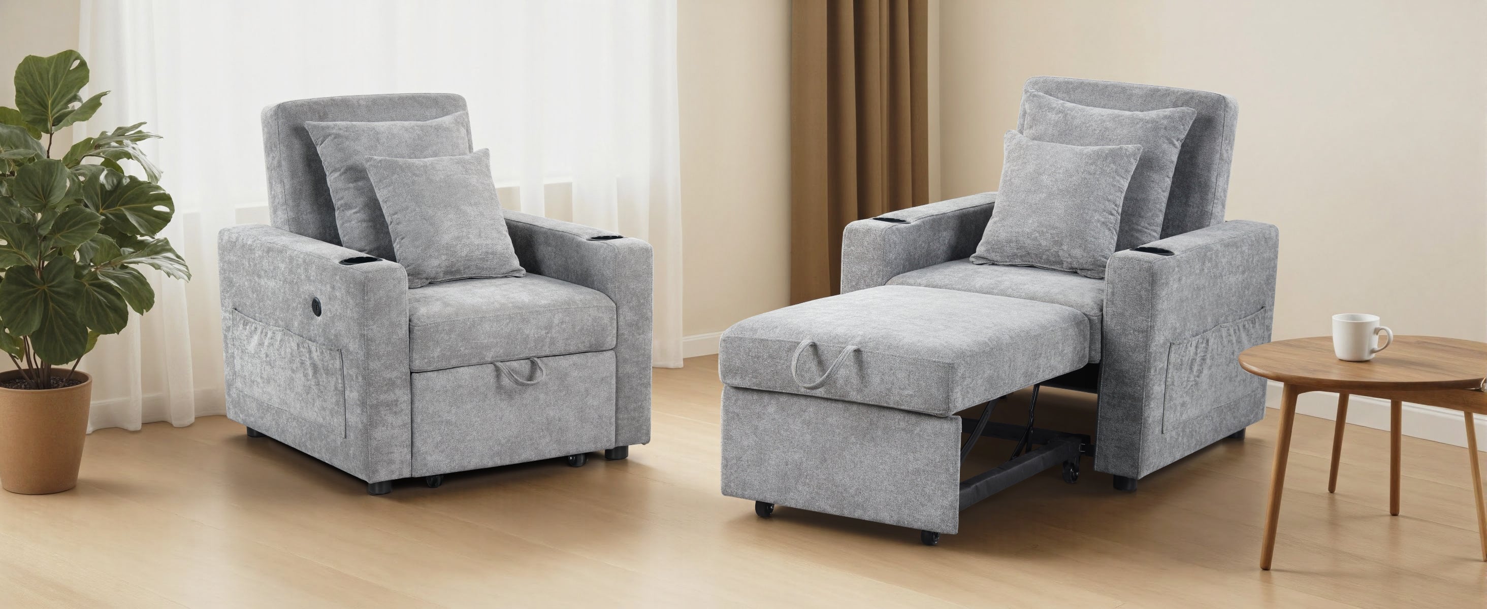 Convenient Features: Enjoy added convenience with dual USB and Type-C ports on the armrest—no more reaching for distant outlets. Side pockets and cup holders keep your phone, remote, and drinks right by your side