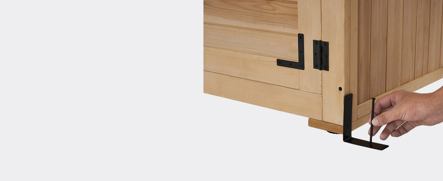 - Adjustable Feet & Metal Ground Brackets: The outdoor tool storage shed has 4 adjustable feet and 4 metal ground brackets to adjust the wood shed, so don't worry about the uneven ground.