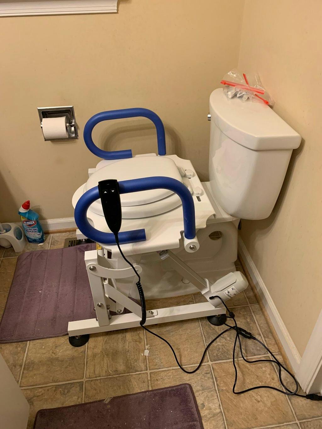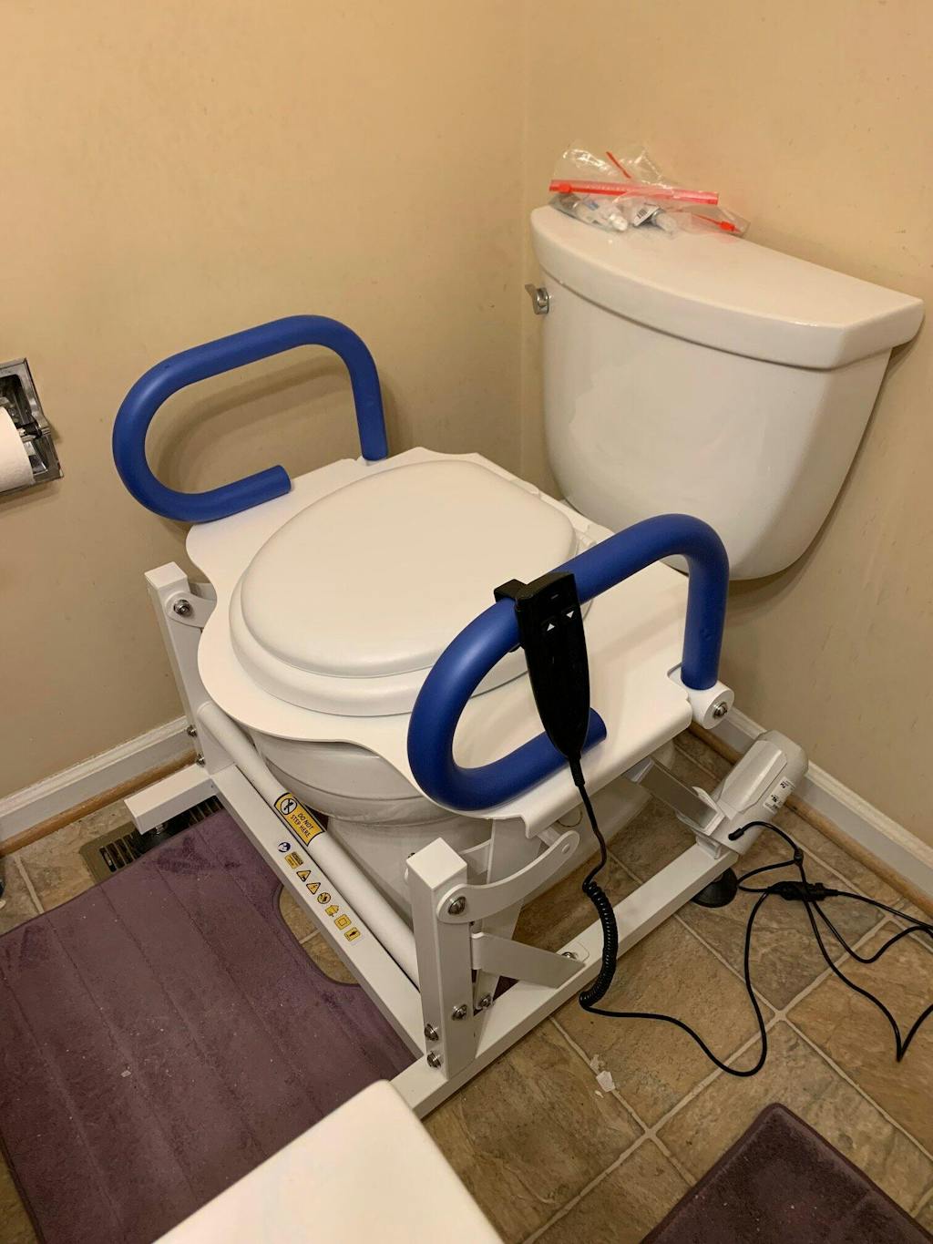 Once the device was put together and the new padded seat attached on top, I placed the lift around the toilet bowl, plugged it in and tested it out. It worked great, though slow (which can be a good thing) and seemed to rub against the bowl slightly at its lowest point, making a quick brief initial shake and noise going up and down, which I had to warn Dad would happen. Otherwise, it's been a wonderful help.