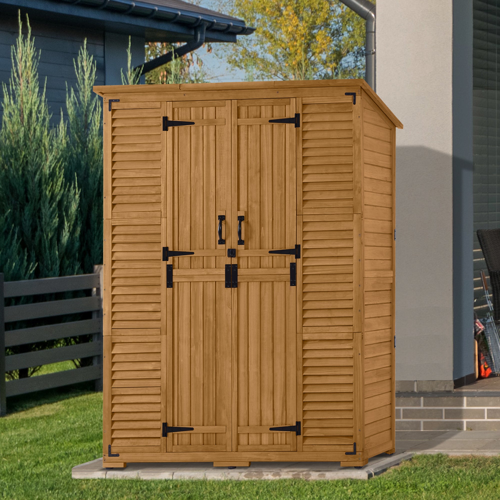 - Large Wood Shed: Hide the messy objects, pool equipment & chemicals and most garden tools, etc. The tool shed's size is the perfect addition to your garden, patio, deck, porch. (Dimension: 57.9" x 26.8" x 78.4")
