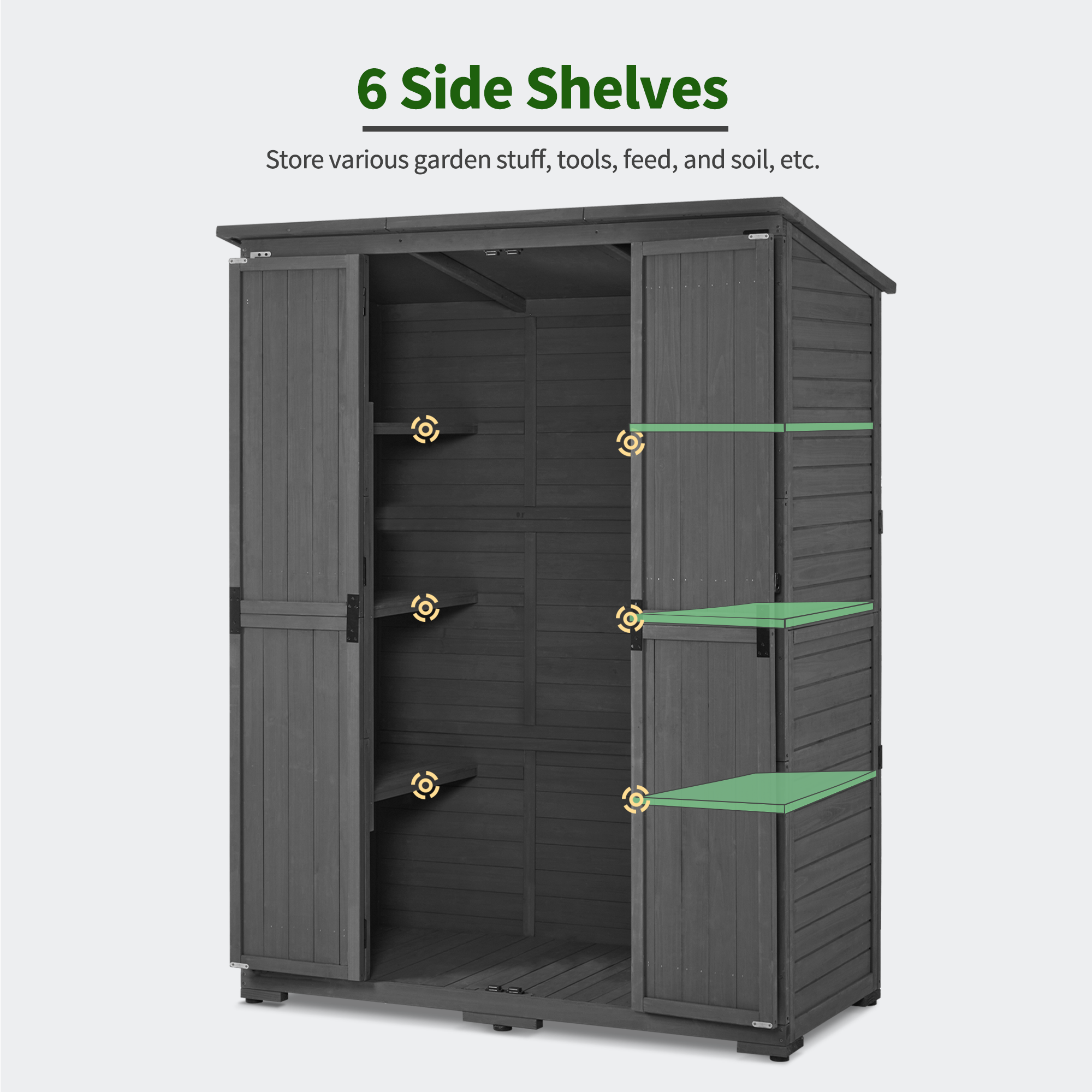 - Multiple Storage Spaces: Inside the outdoor storage cabinet there are 6 shelves and 1 large space for long tools to meet you to store various items.