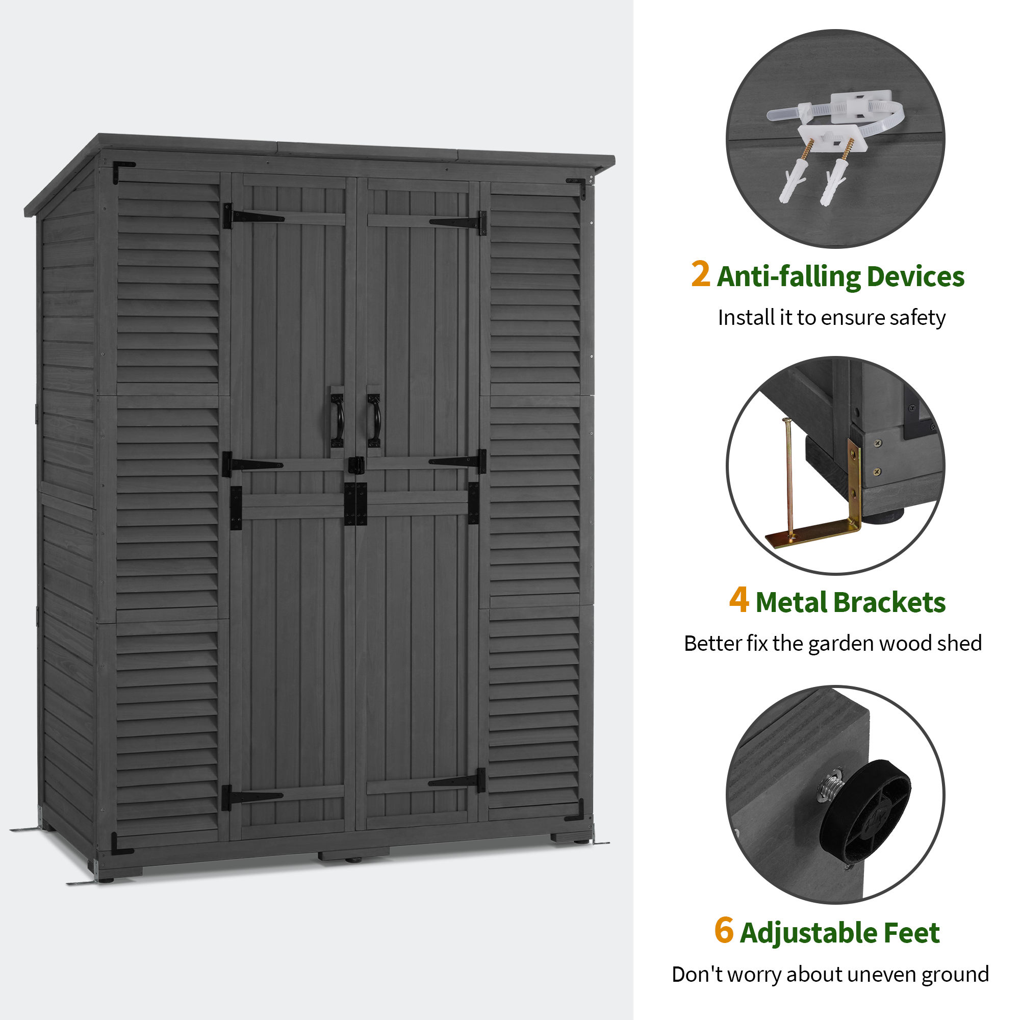 - 4 Metal Brackets & 2 Anti-falling Devices: The tall outdoor cabinet is equipped with 4 reinforced metal ground brackets and 2 anti-fall devices for enhanced stability and safety.