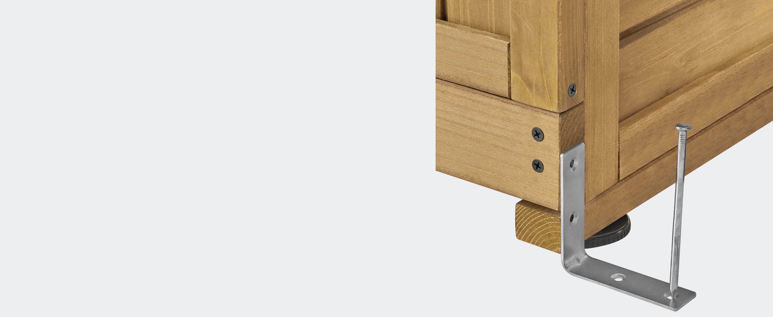 - Anti Tip Bracket Kit: To enhance stability, the tool shed includes 4 reinforced metal ground brackets and 2 anti-fall devices; Fix the brackets to the ground to prevent moving, and install the anti-fall kits to the wall to prevent tipping