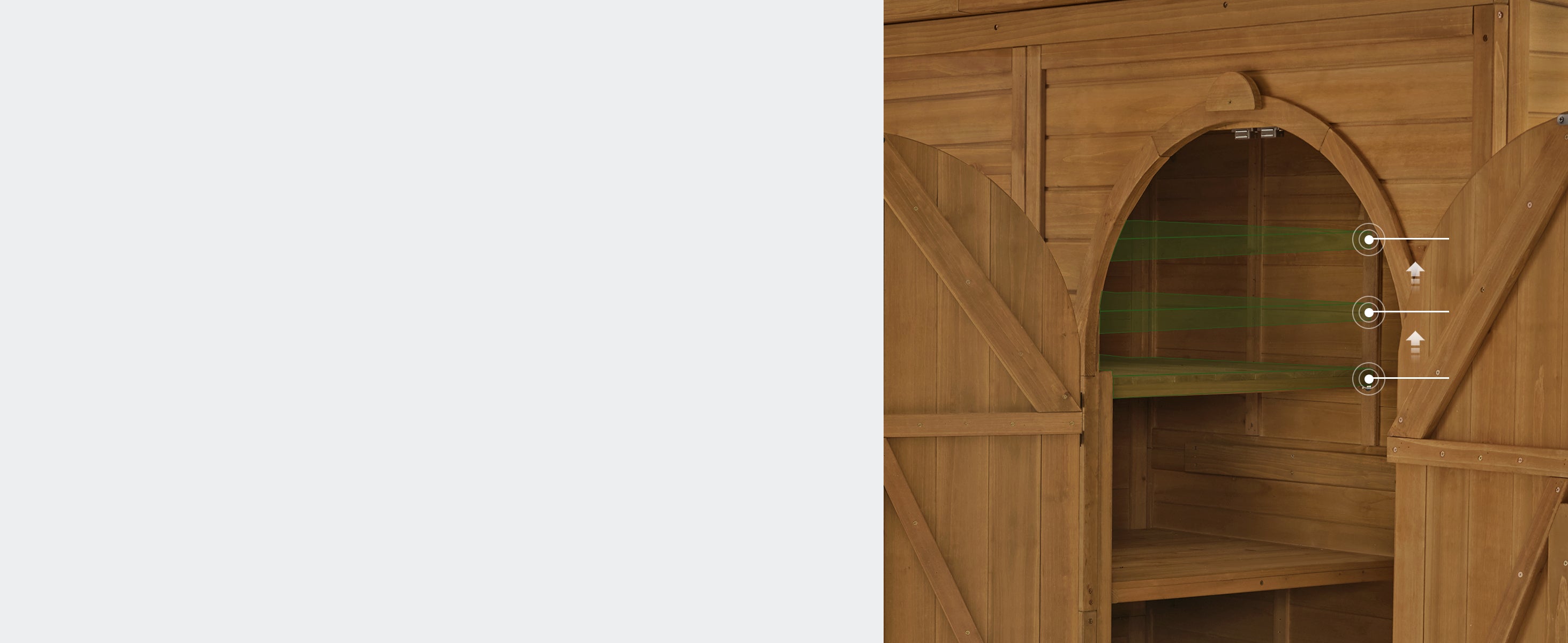 - House Shaped Design: This wooden storage cabinet resembles a small house; With a unique design that meets various storage needs while serving as a decoration, adding fun to your garden or indoor space
