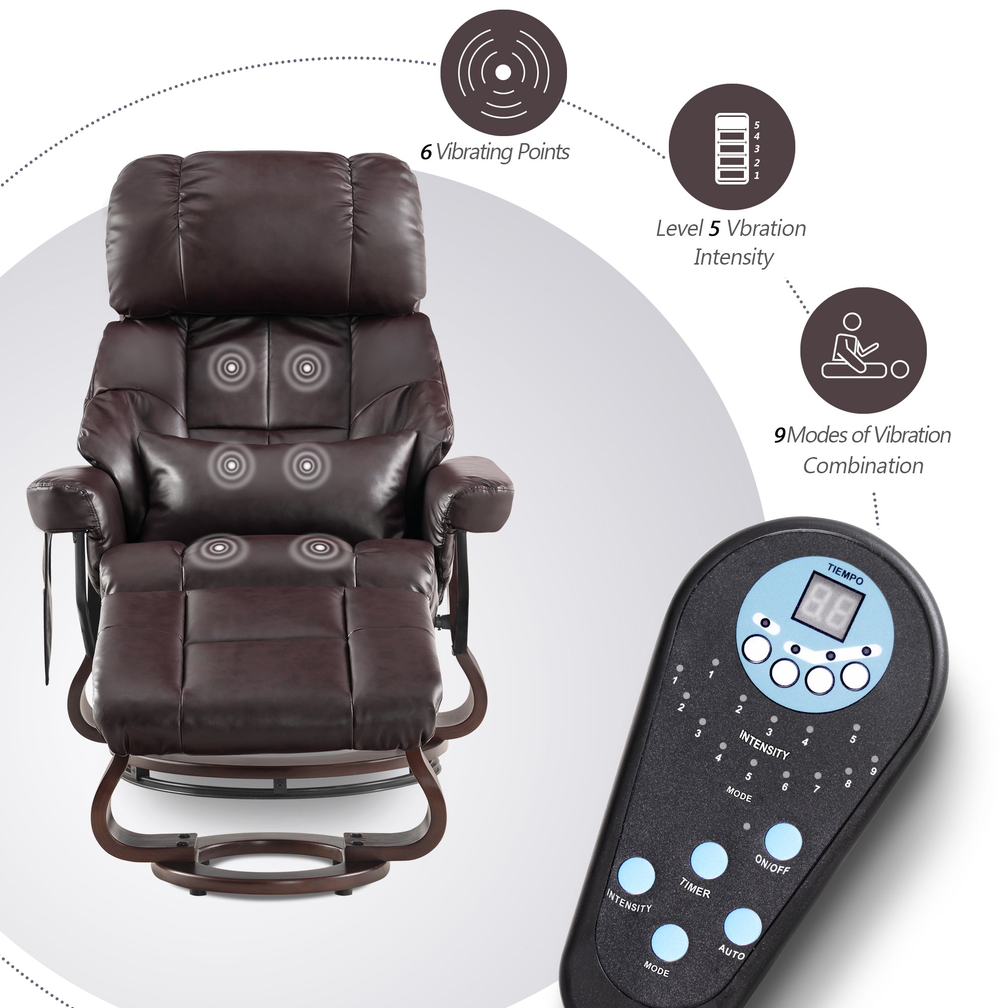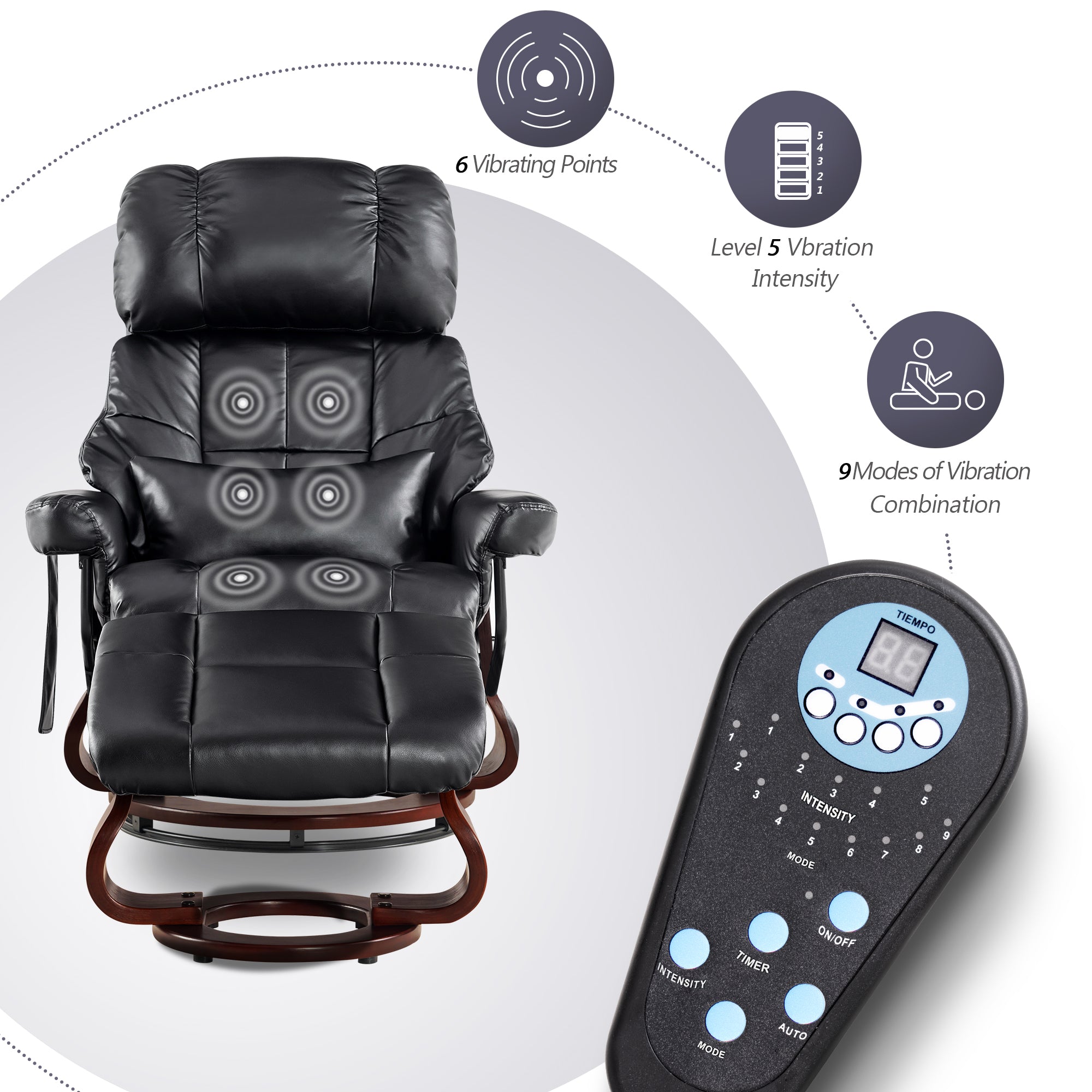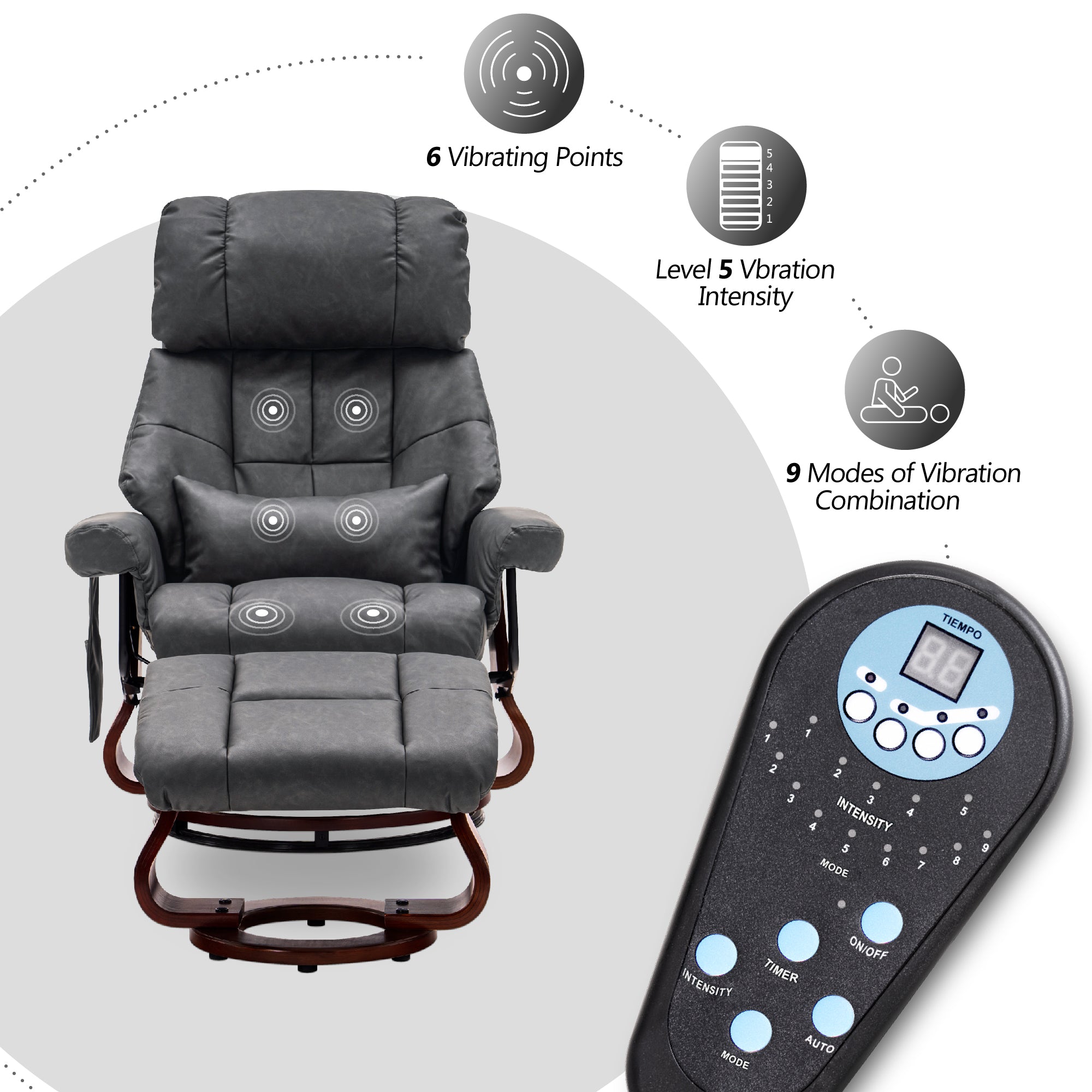 - 3 massage positions for back, lumbar, and thighs, with 5 modes and 6 nodes