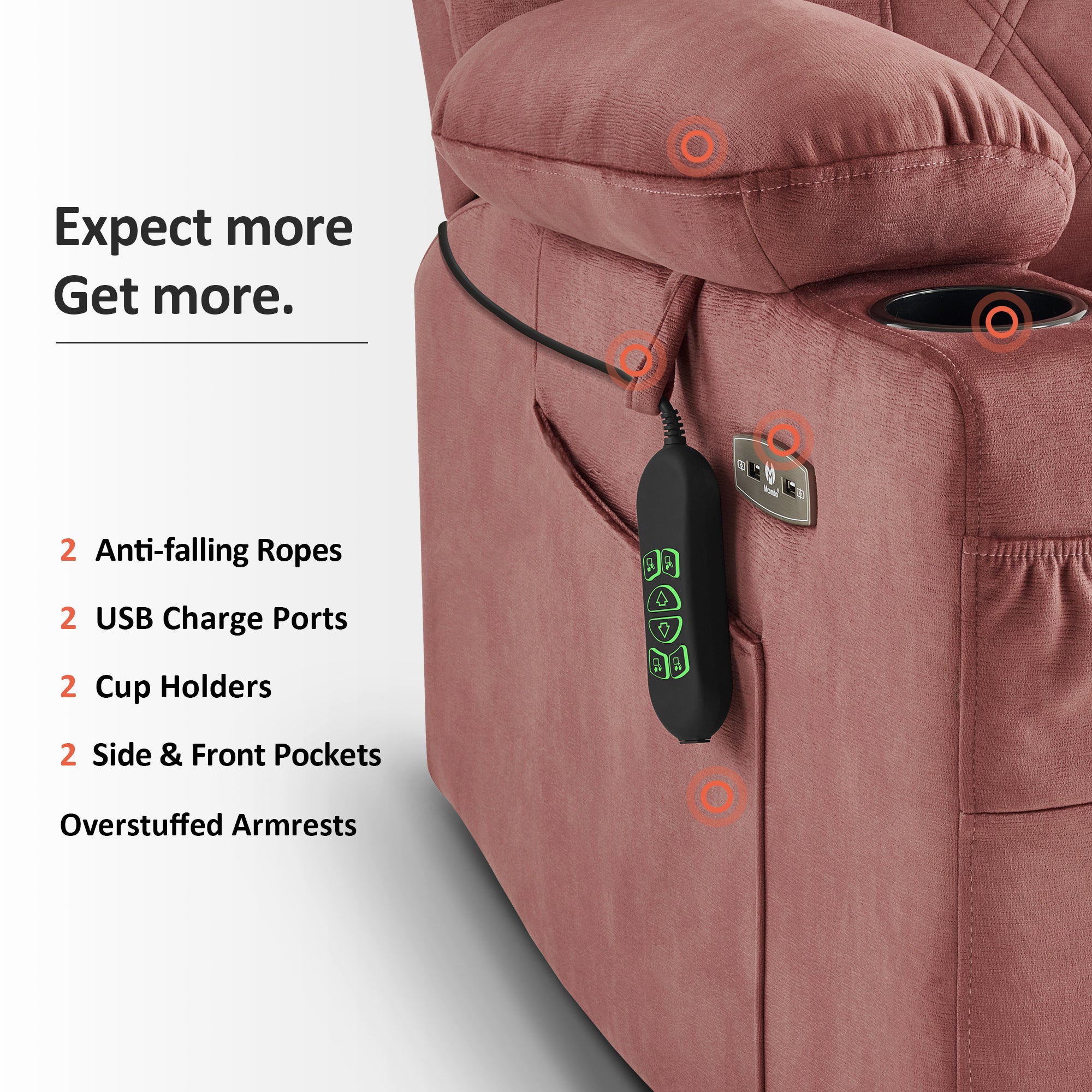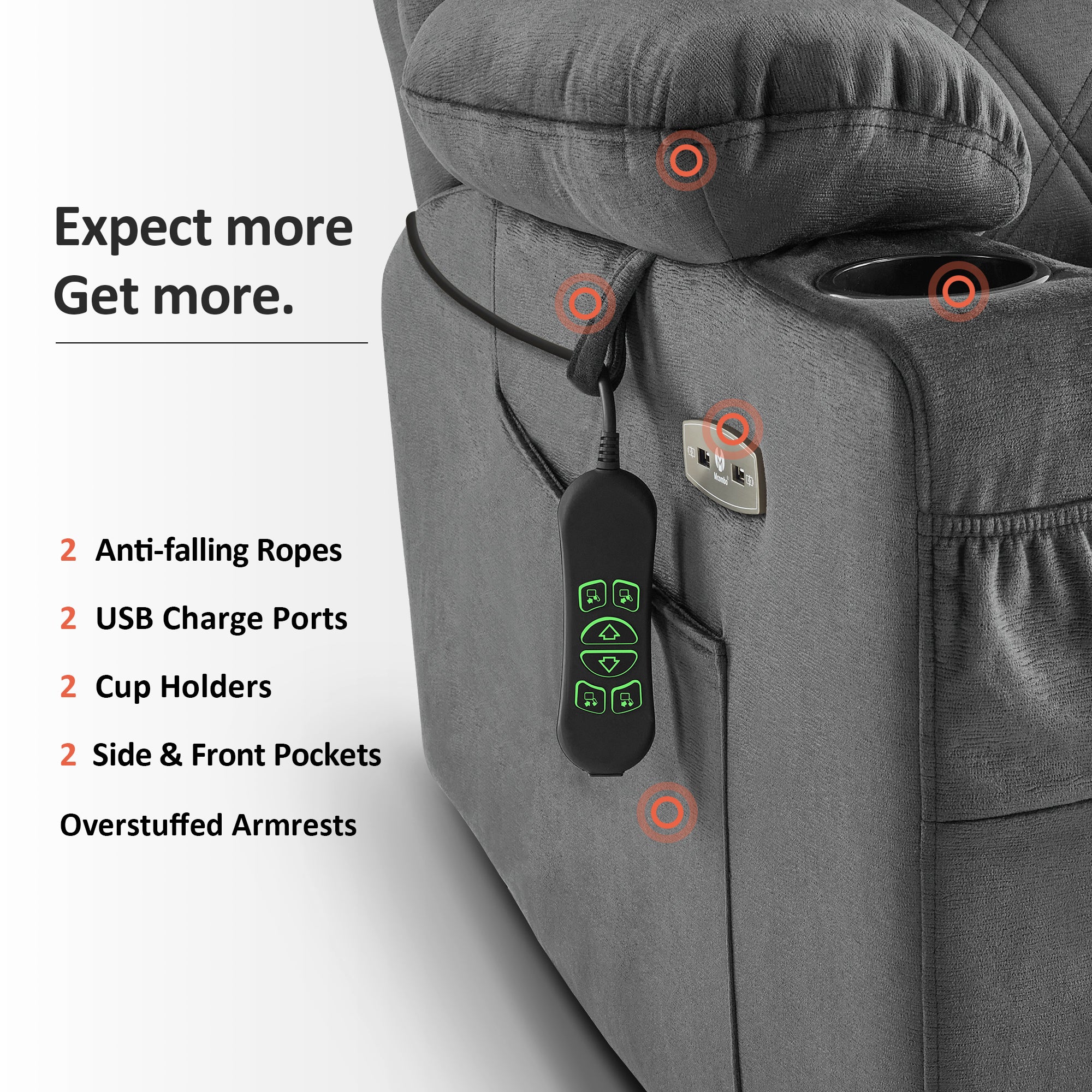 - Massage with 8 vibration points and lumbar seat dual heating.