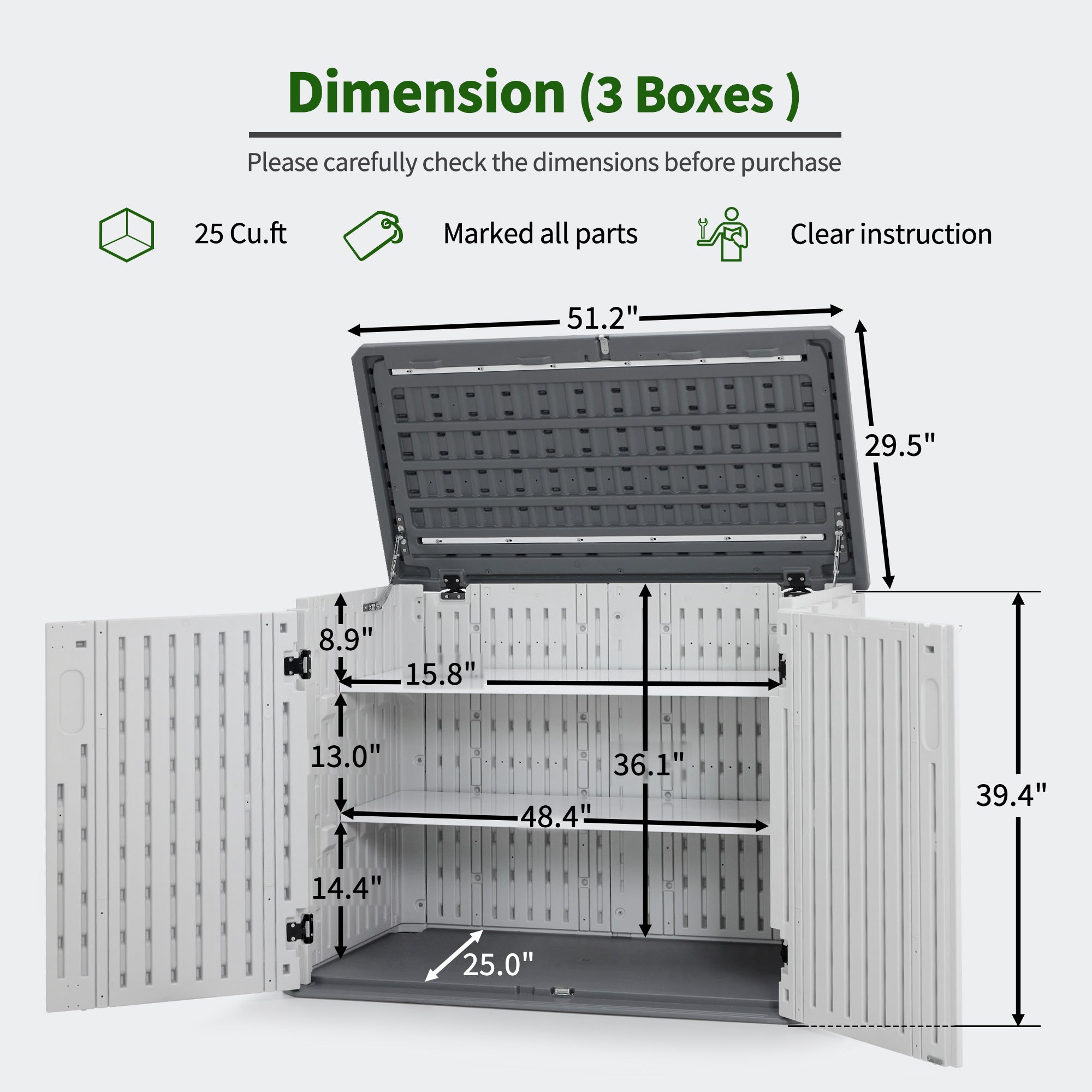 Small Plastic Shed: Overall Dimension: 52.16 (W) x 28.34 (D) x 38.58 (H) inch; Internal Dimension: 48.43 (W) x 25.00 (D) x 36.10 (H) inch