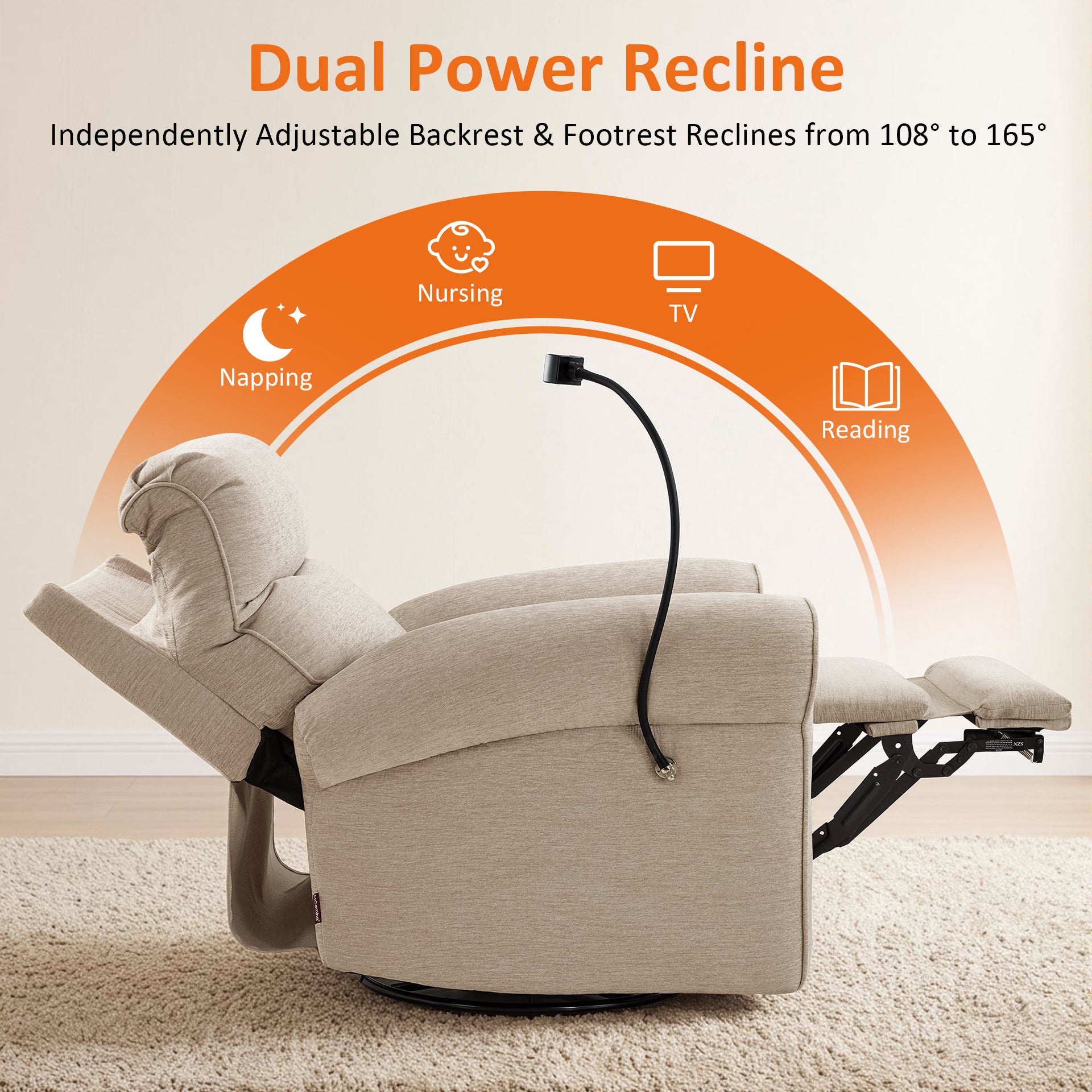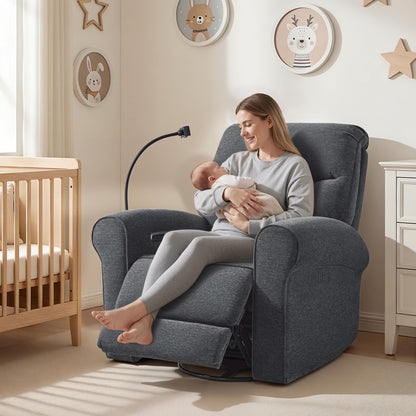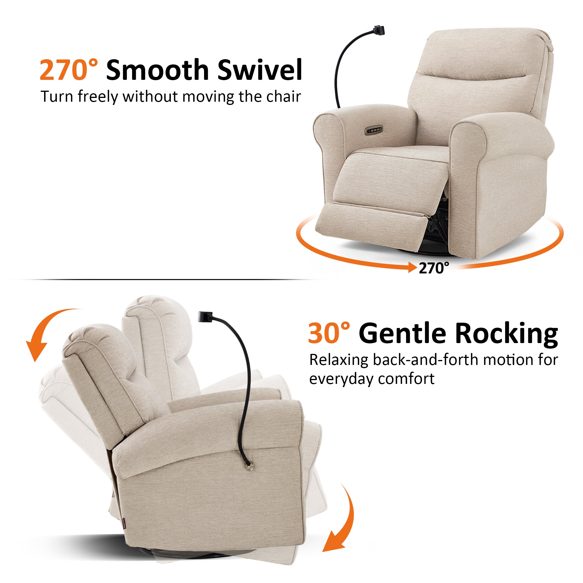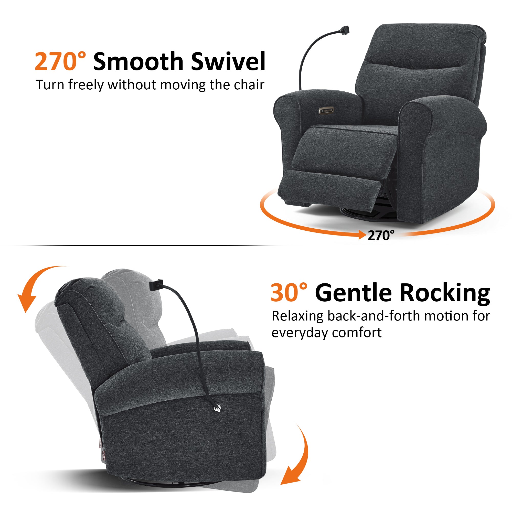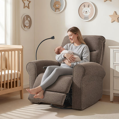 - Swivel & Rocker & Recliner: Effortless 270° swivel lets you reach items or turn toward interaction without standing up. The gentle rocker motion is available from the upright start position through TV and full recline, making it easier to relax or soothe a child while staying comfortable. Backrest and footrest adjust independently, allowing you to raise your legs without moving your upper body and recline smoothly from 108° to a restful 165°