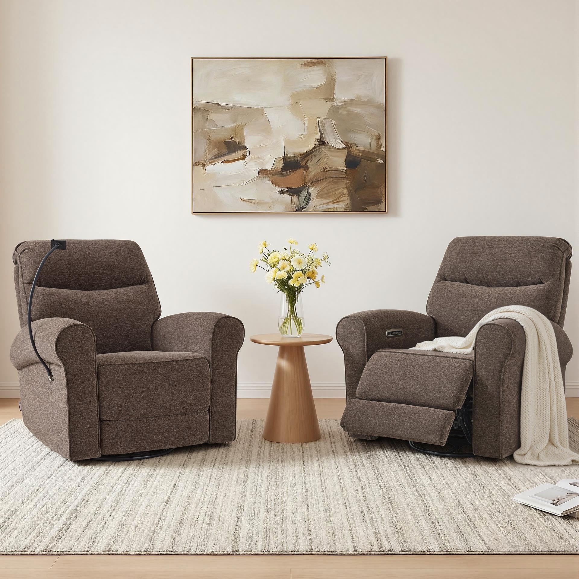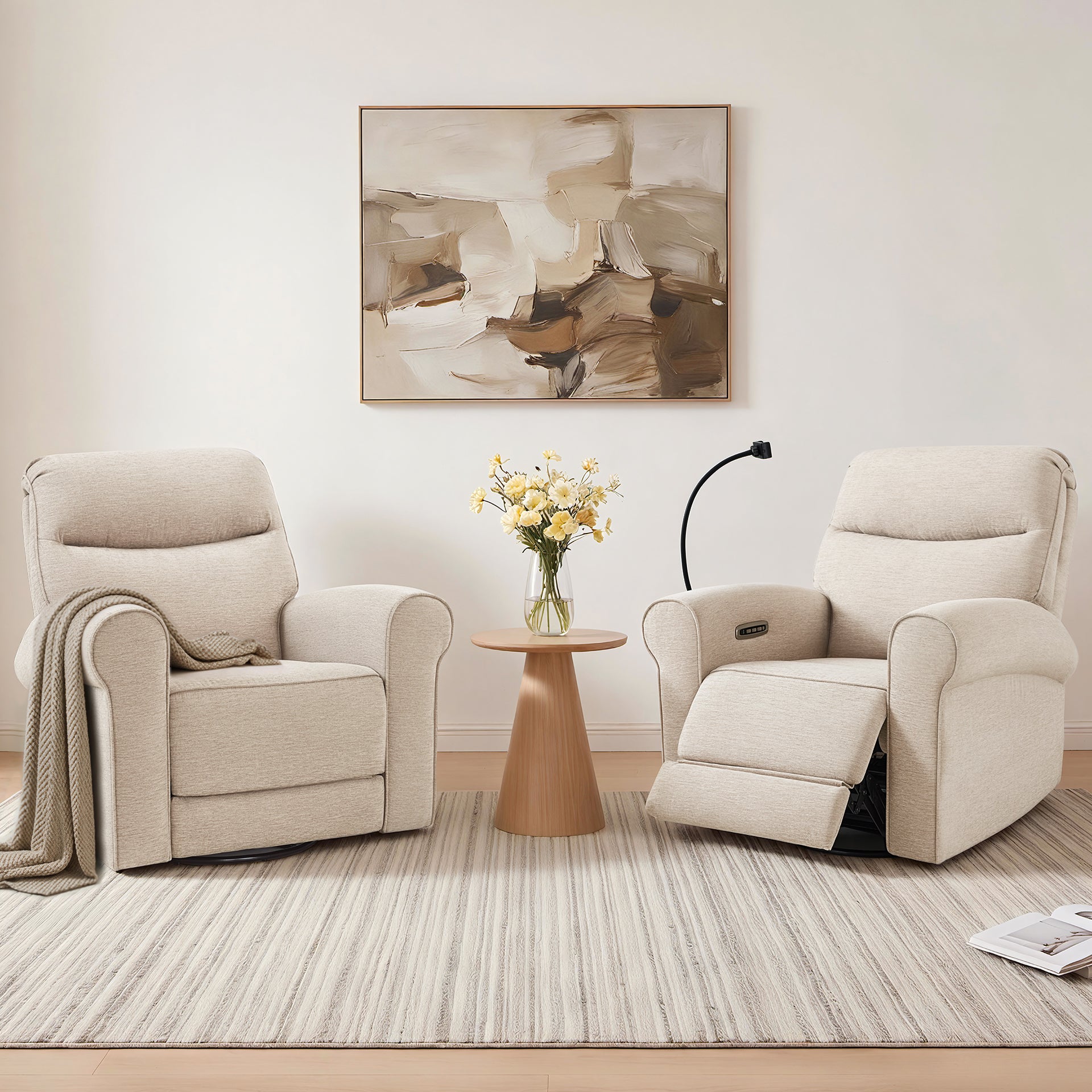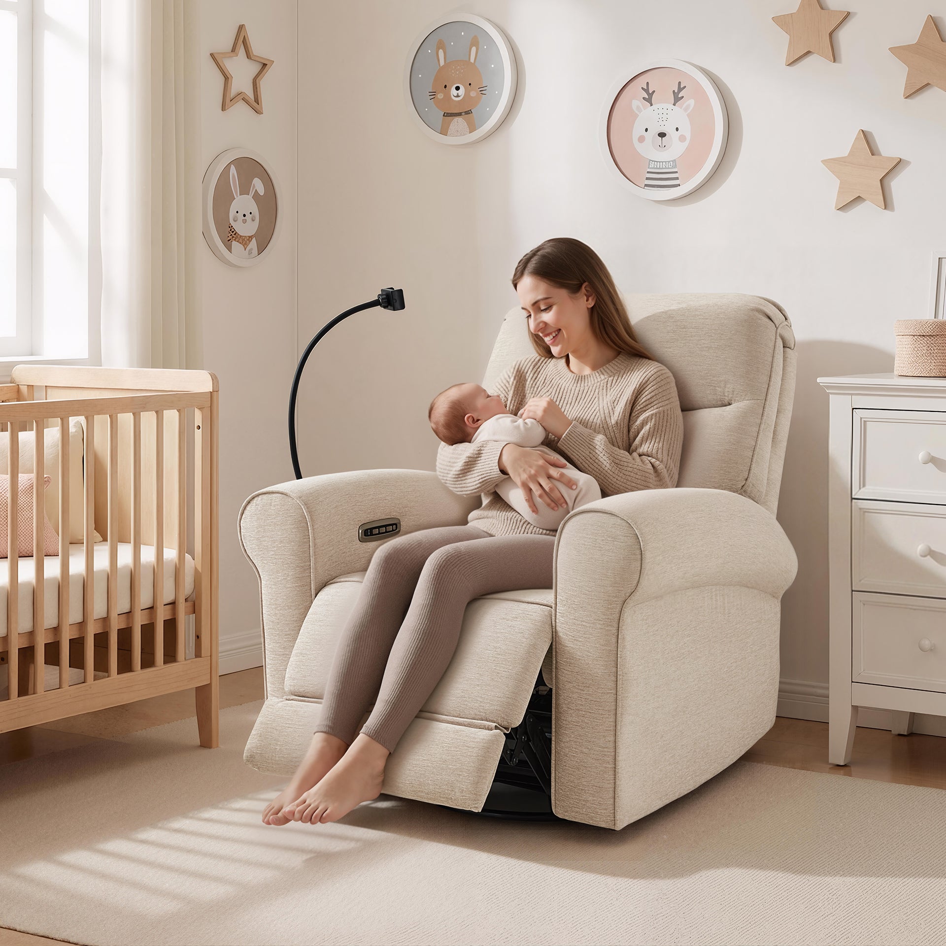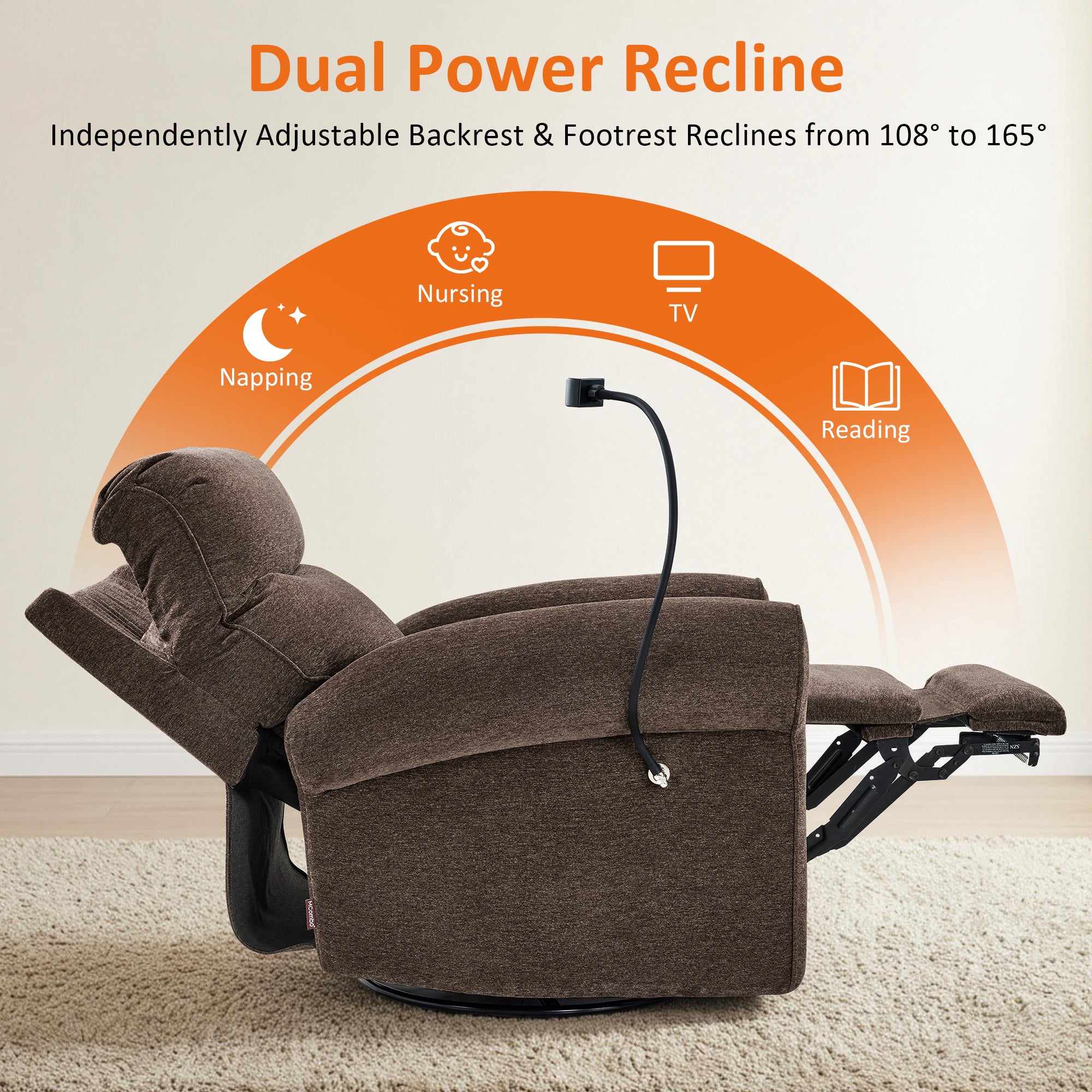 - Swivel & Rocker & Recliner: Effortless 270° swivel lets you reach items or turn toward interaction without standing up. The gentle rocker motion is available from the upright start position through TV and full recline, making it easier to relax or soothe a child while staying comfortable. Backrest and footrest adjust independently, allowing you to raise your legs without moving your upper body and recline smoothly from 108° to a restful 165°