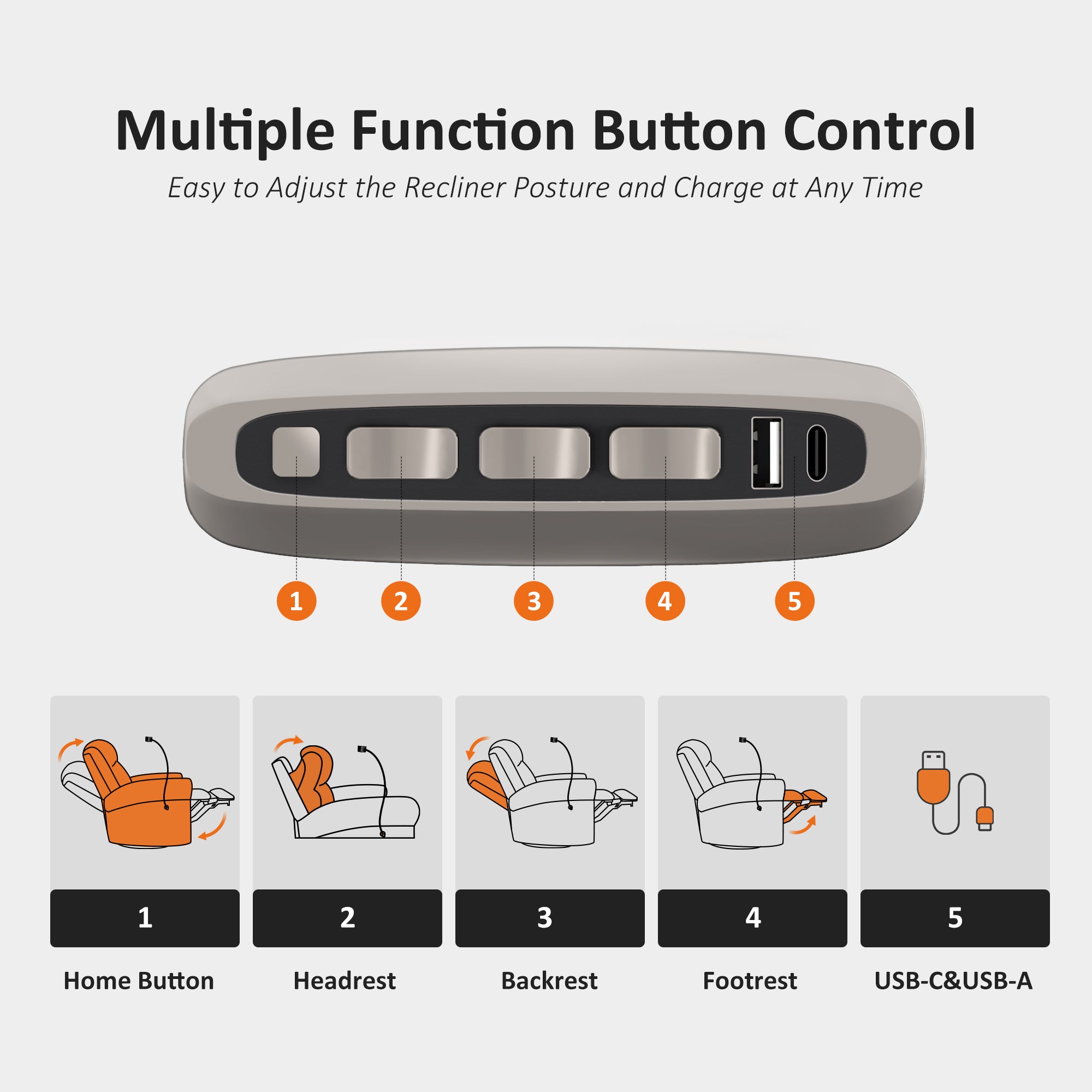 - Button Control & USB Charging: All controls are located on the inner armrest panel for easy reach. Integrated USB-C & USB-A ports let you charge phones and tablets while you relax — no need to get up to find a charger