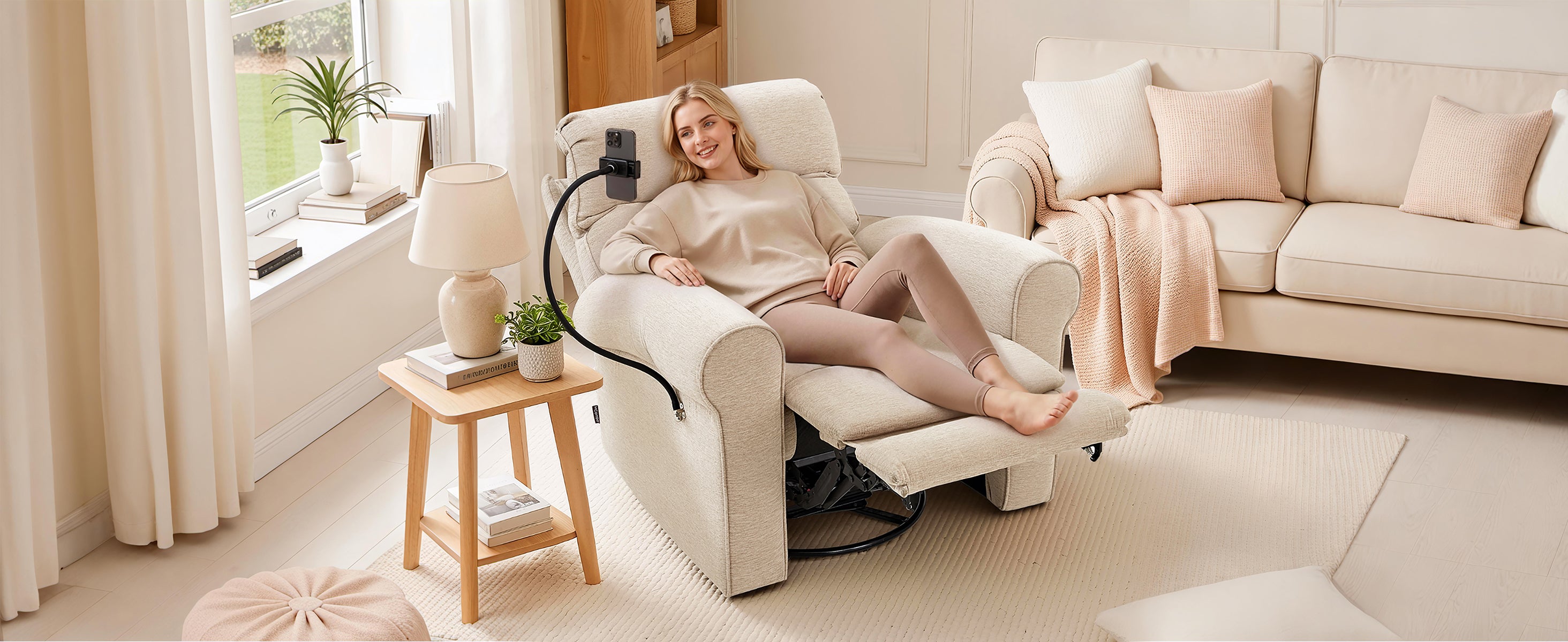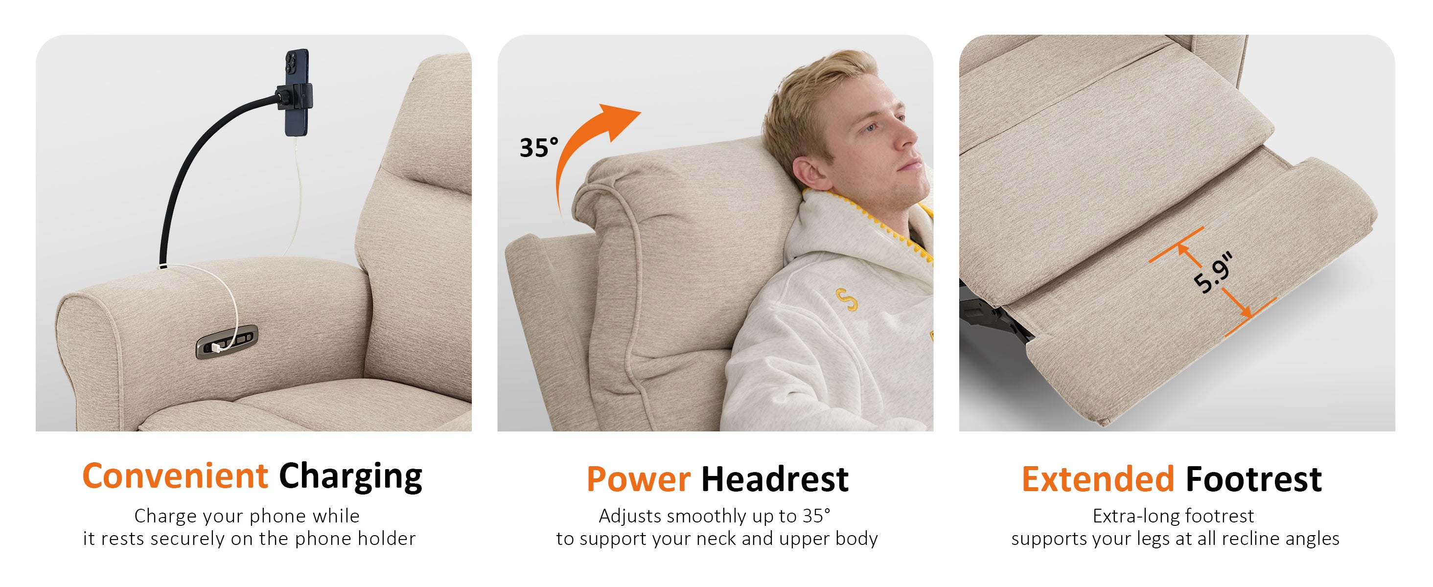 - Removable & Foldable Phone Holder: The adjustable phone holder keeps your device in view while you relax. When not in use, fold it down and hide it beside the armrest— ideal for hands-free video watching while holding a baby or multitasking