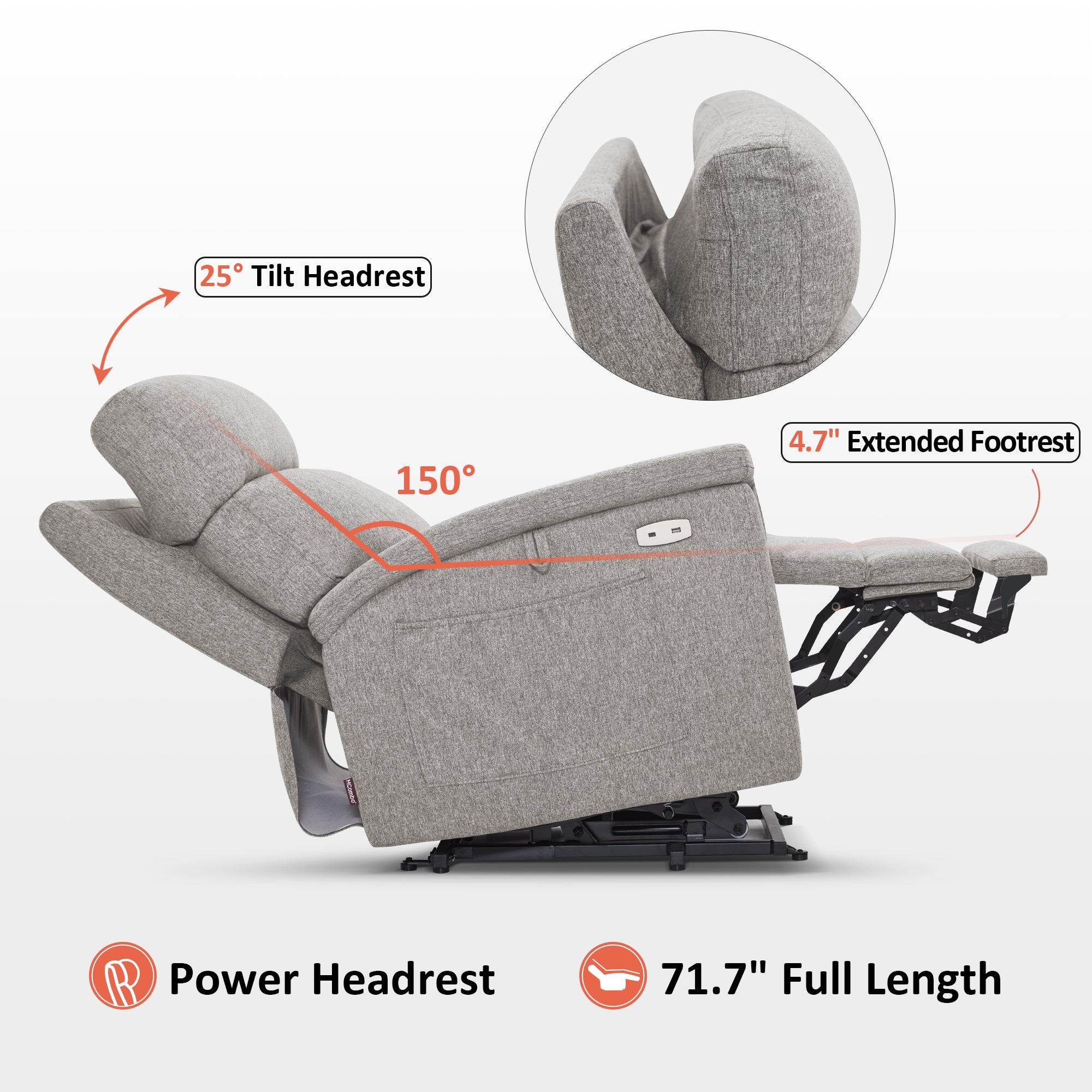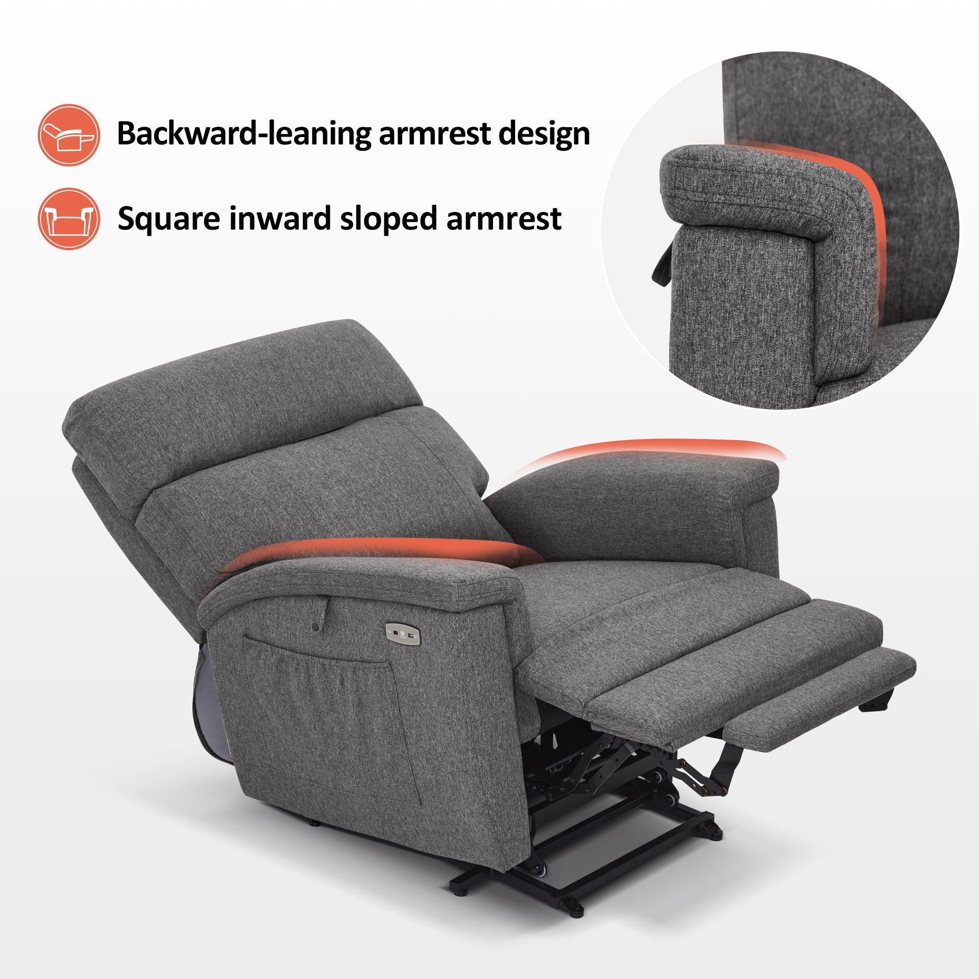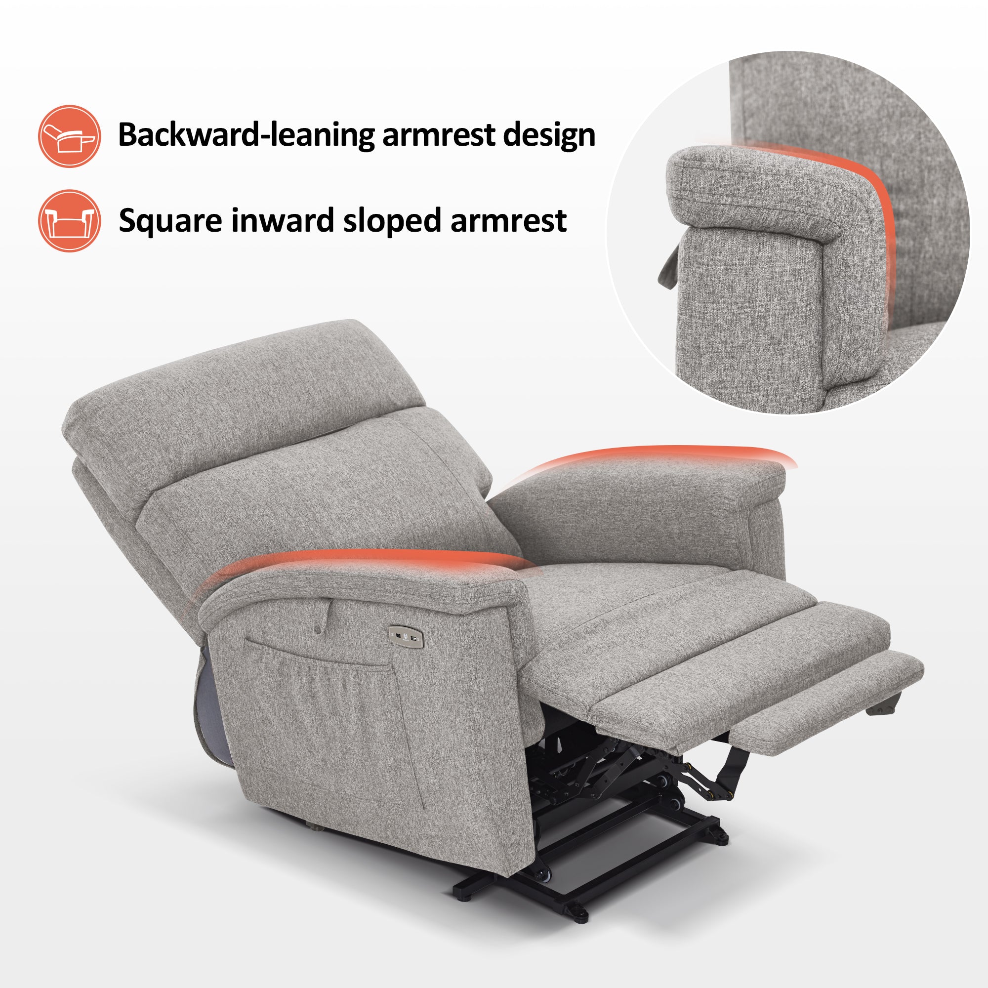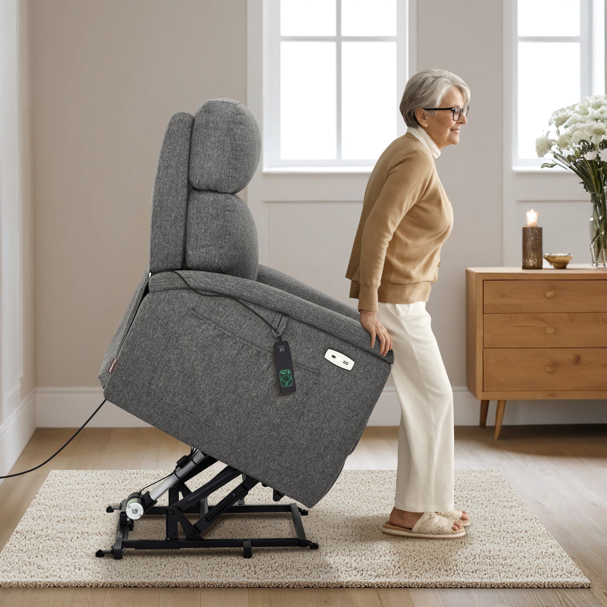 - Power Lift Assistance: Counter-balanced lift mechanism to assist the senior in standing up easily, and smoothly adjusting to the lift or reclining position you prefer by pressing buttons (Max reclining angle: 150°)
