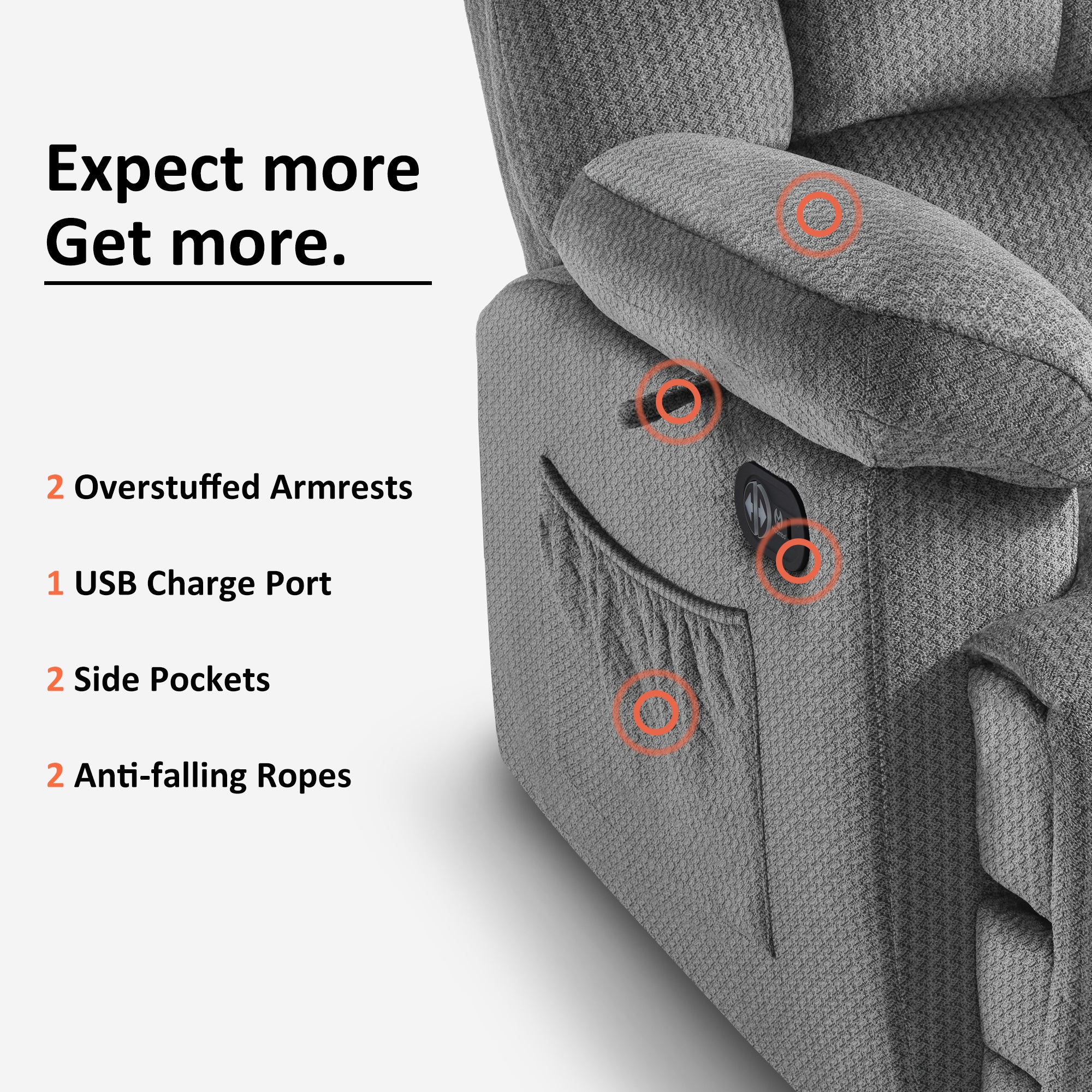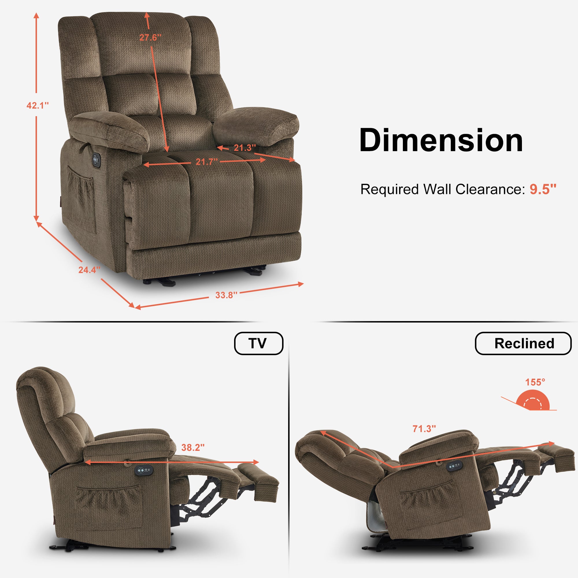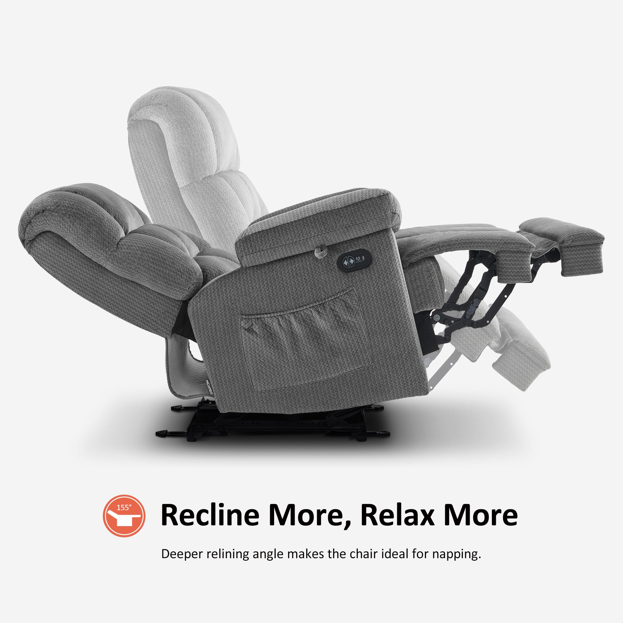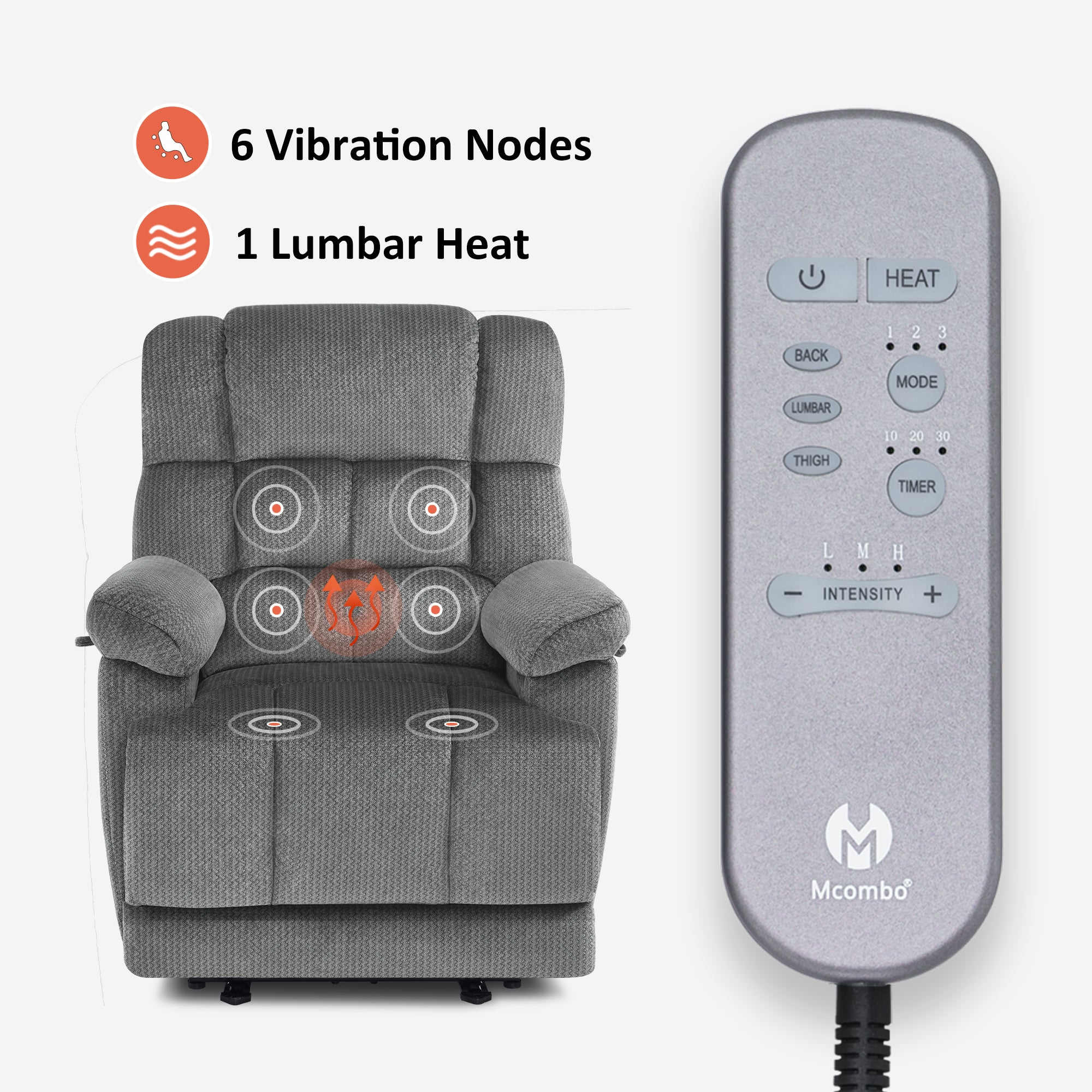 In terms of vibration function, the vibration of this recliner contains 3 intensities, 4 modes, and 6 positions, which can be used in any combination.. And the heat is on the lumbar, which can work separately with the vibration.On this basis, you can adjust the vibration and heating time, which are 10/20/30min respectively.