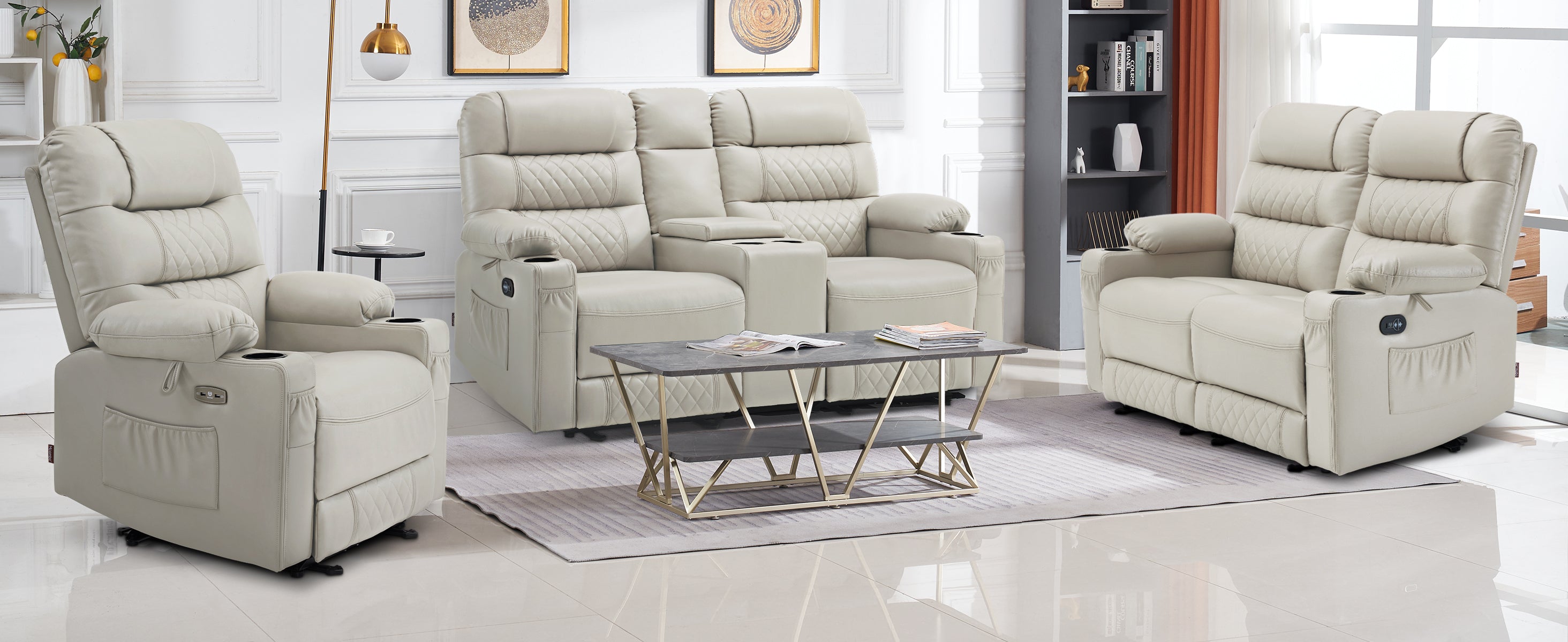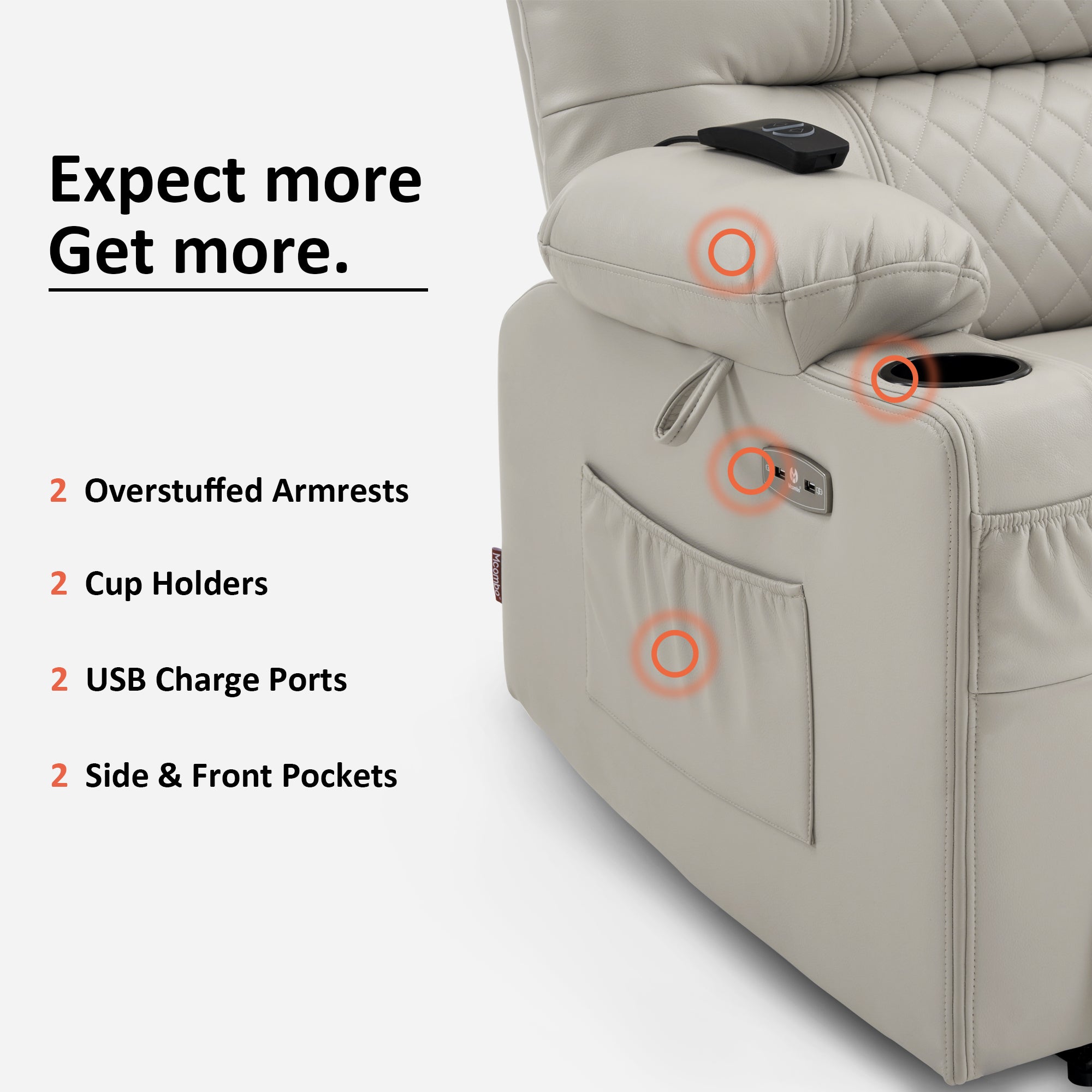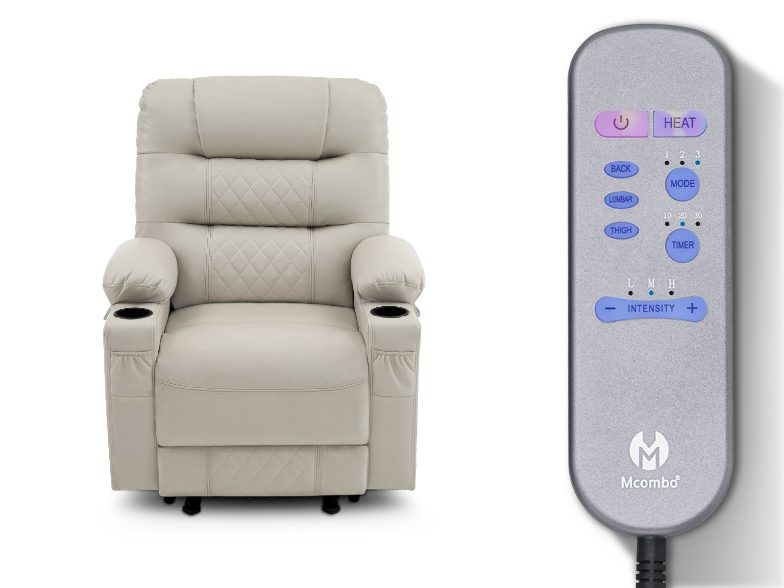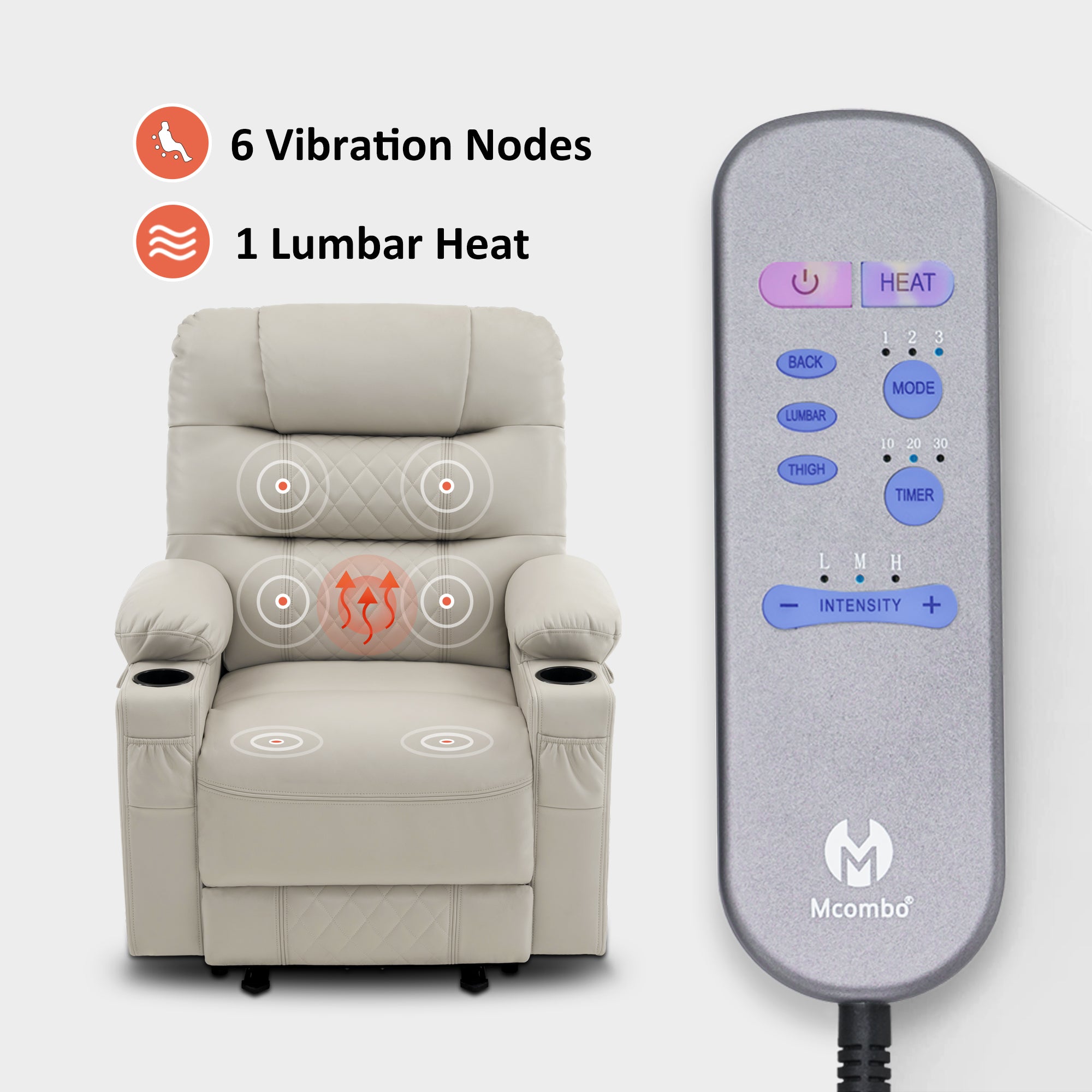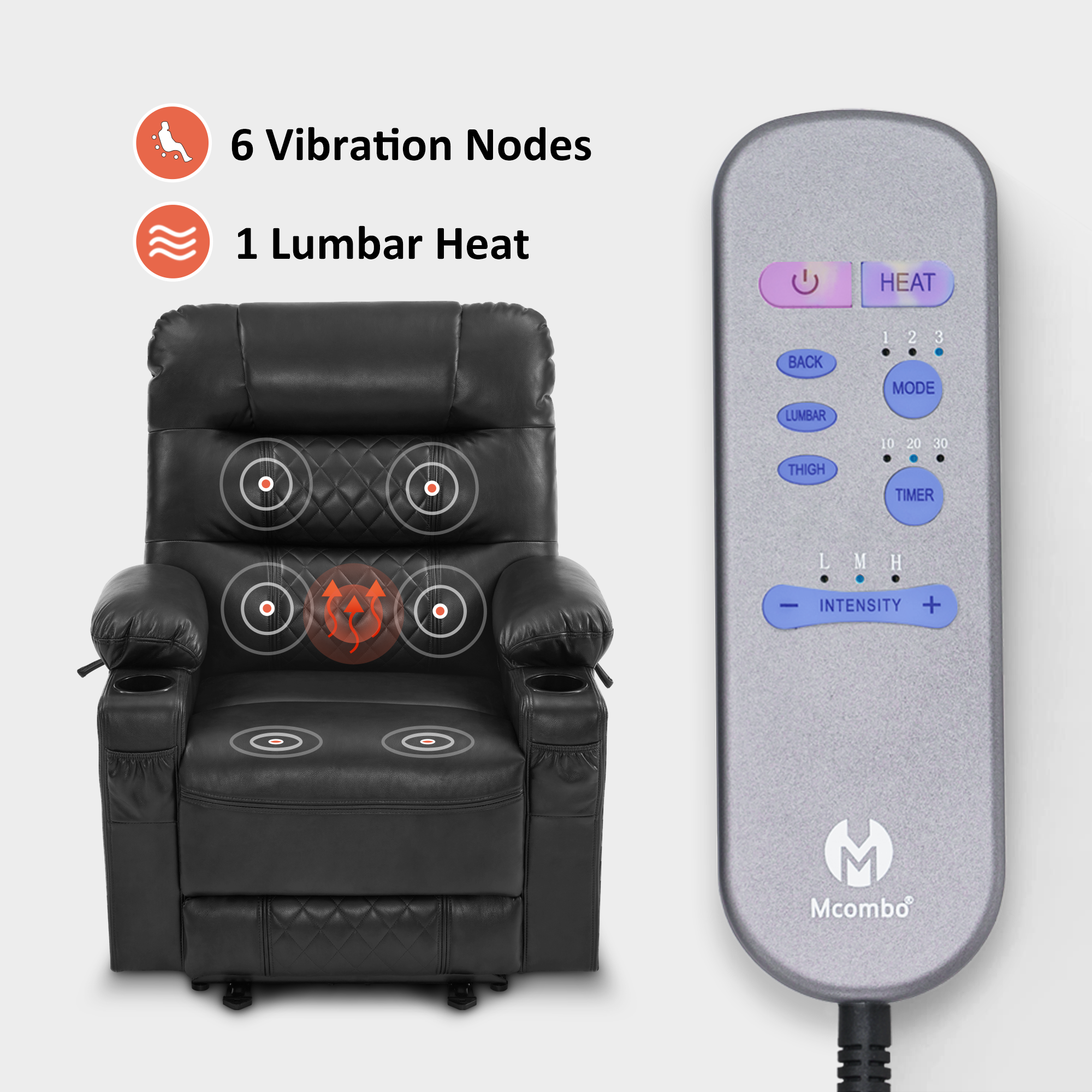 In terms of vibration function, the vibration of this recliner contains 3 intensities, 3 modes, and 6 positions, which can be used in any combination. And the heat is on the lumbar, which can work separately with the vibration.On this basis, you can adjust the vibration and heating time, which are 10/20/30min respectively.