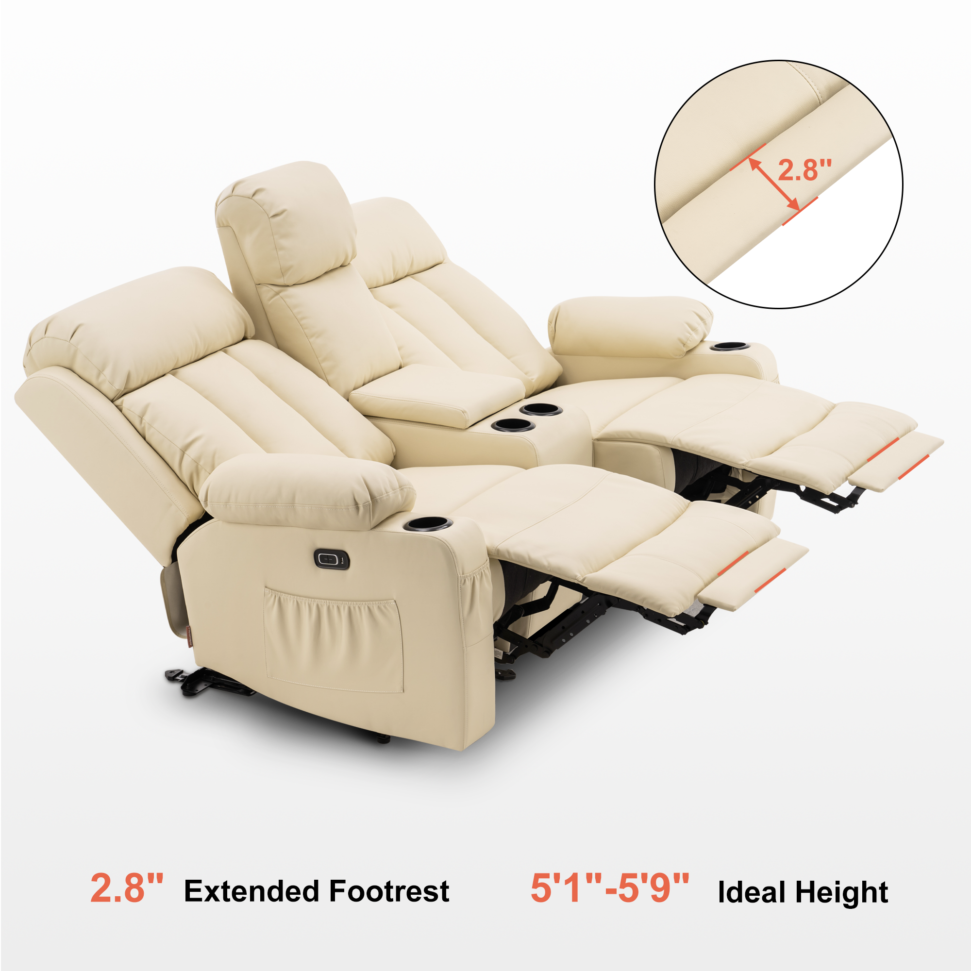- Cup Holders, Side Pockets, USB Port for convenience