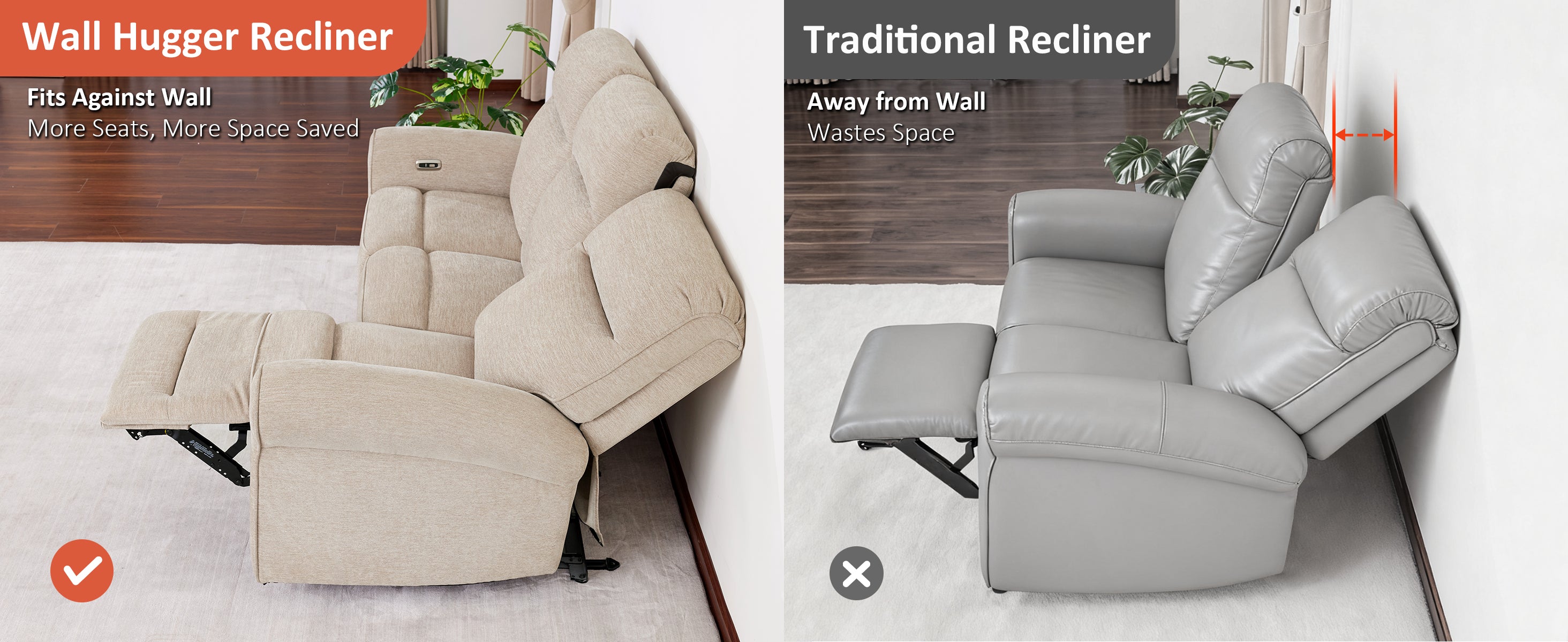 - Wall Hugger Reclining Sofa: With only 1.4” of clearance required from the wall, this recliner saves valuable space behind it. The fixed center seat adds extra seating, making it ideal for cozy living rooms, compact apartments, or large families who need flexible space