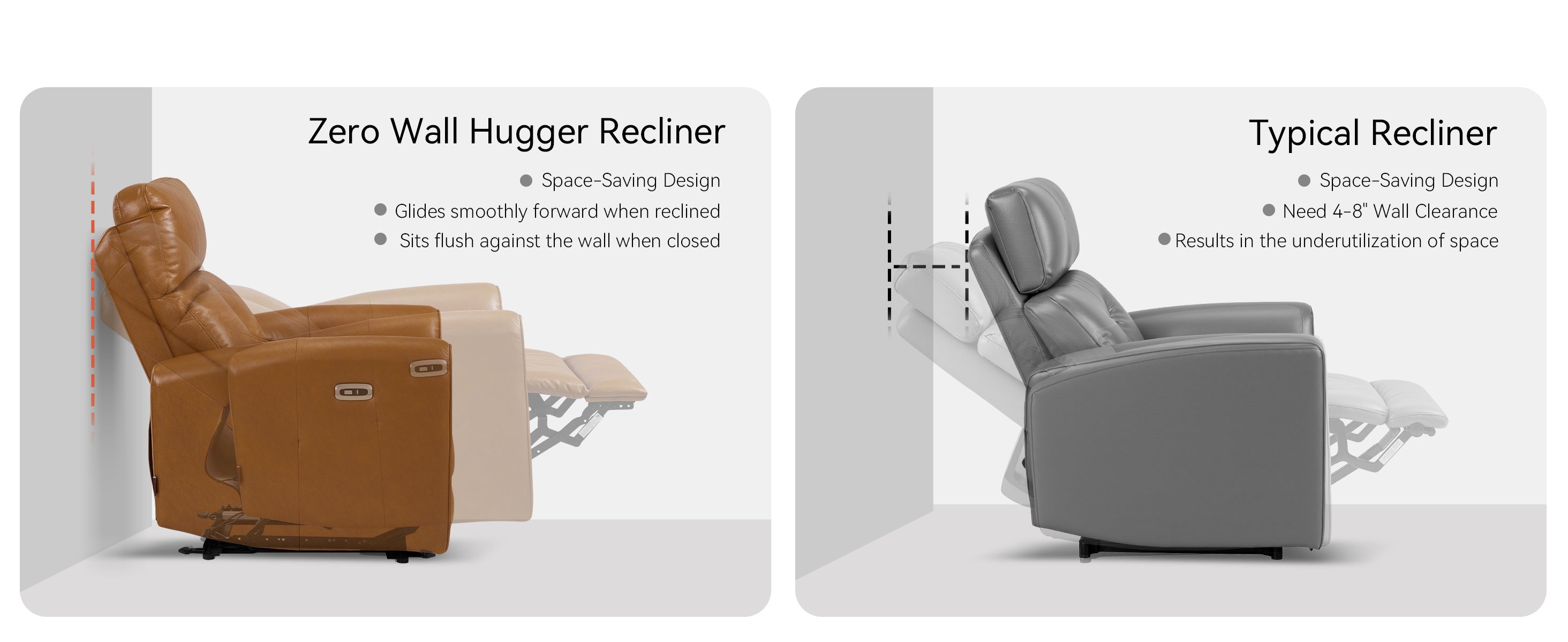 Zero Wall Hugger Recliner: Wall hugger recliner can be placed directly against a wall. When the back of the seat leans down, the seat base automatically moves forward so that the back of the recliner doesn't hit the wall, suitable for small spaces.